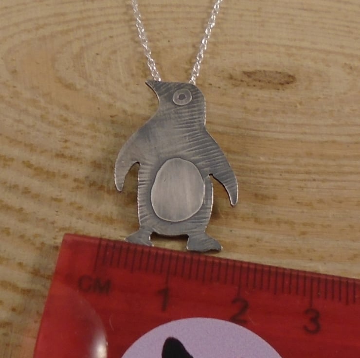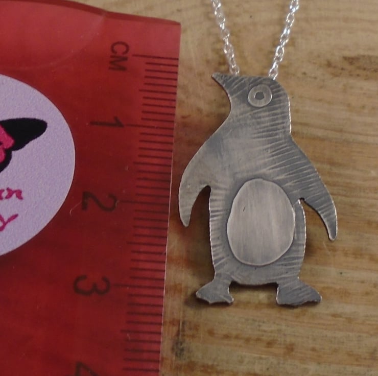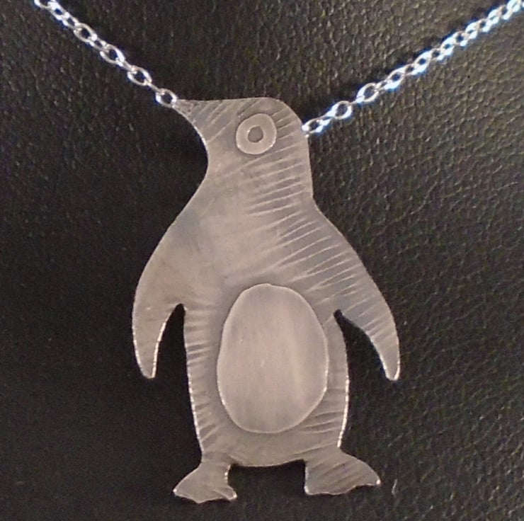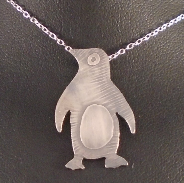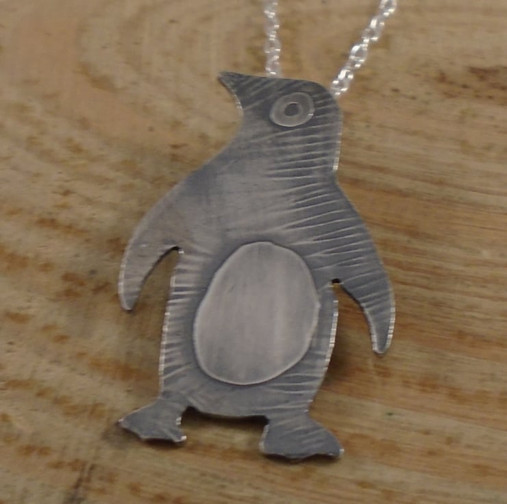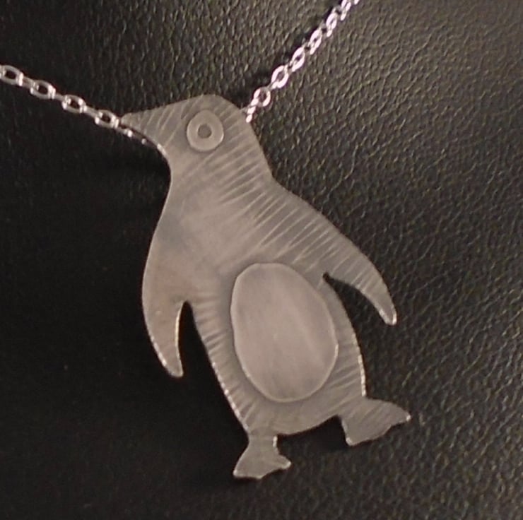 A simple and cute penguin necklace, hand made from sterling silver. The shape of the penguin has been hand pierced from a sheet of silver. The details have then been hand drawn and etched, and a loop has been soldered to the back for the chain. The necklace has then been oxidised to blacken the etched details.