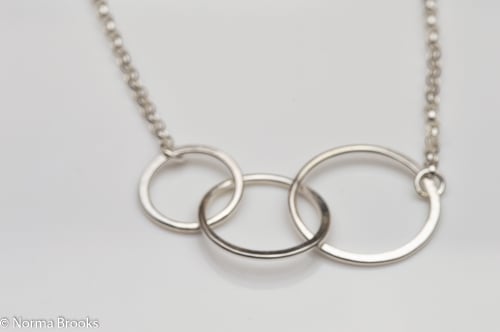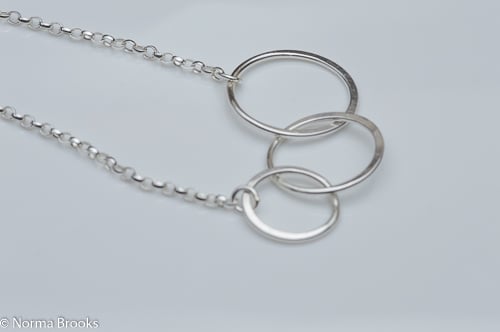 A celebration necklace 3 rings for 3 fabulous decades. the focus is the three linked rings presenting three decades. The rings which have been flattened on one half are 26mm, 22mm and 18mm in diameter and are suspended from a fine 18inch chain. This can be personalised by the addition of a 10mm charm which has been hand stamped with an initial.