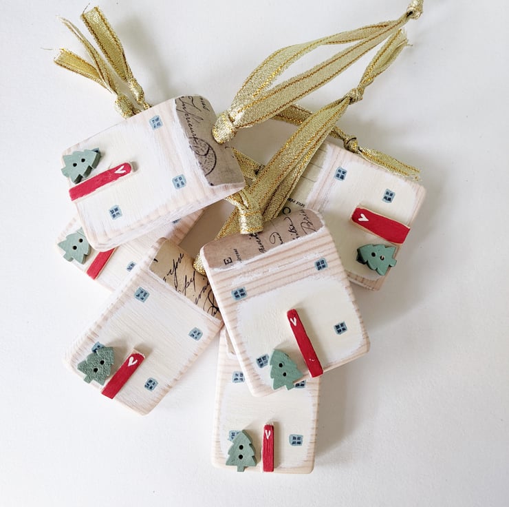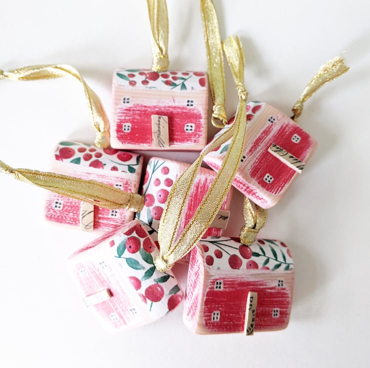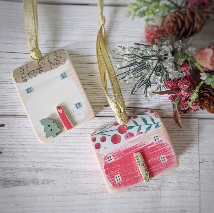 This listing is for one white house with decoupaged script roof and one red house with red berries roof, a selection of two from those pictured. They are all one of a kind!