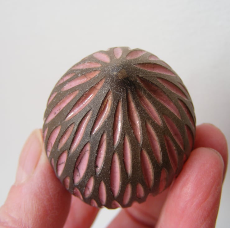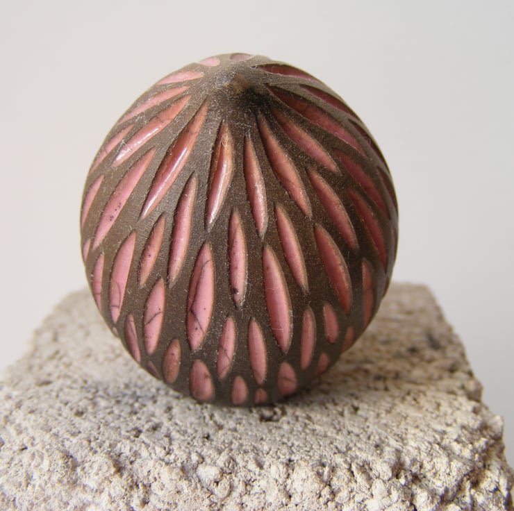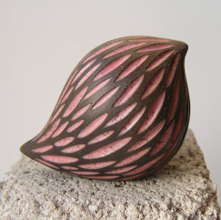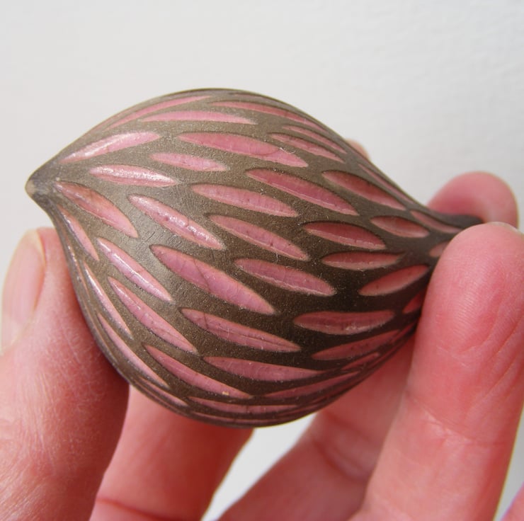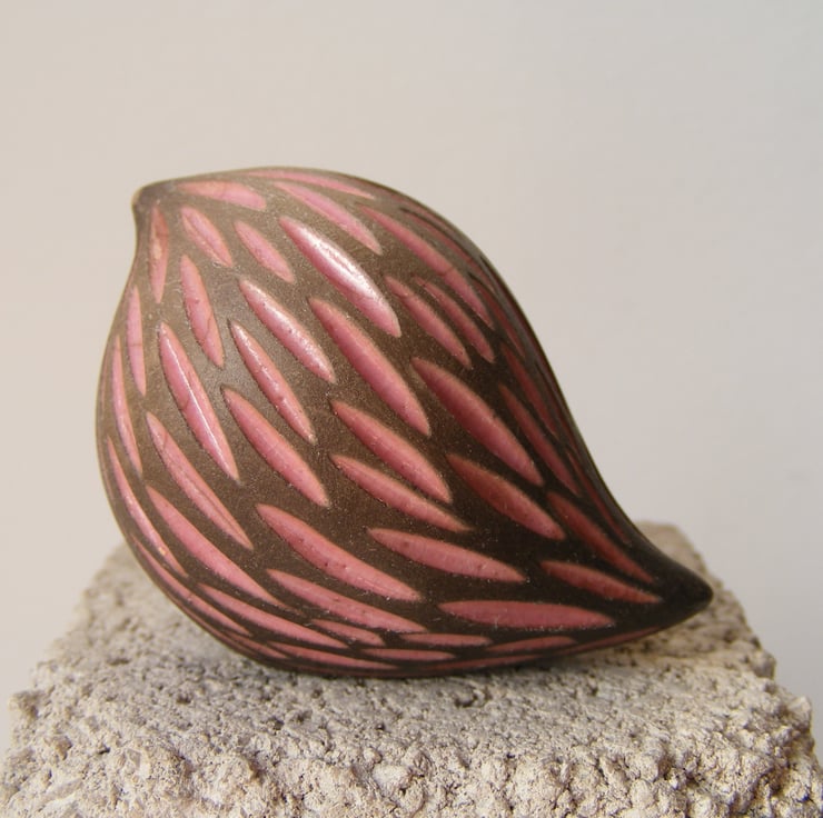 This bird is hand made and measures approx, 4cm high and 5.5cm long. It is made from white earthenware clay and carved before being fired in an electric kiln, it is then covered in pink raku glaze which when dry is wiped back leaving the glaze in the carved indents, it is then raku fired in a gas kiln, the dark part of the bird is unglazed so comes out a black/greyish colour after being smoked in sawdust, it is then lightly sanded and polished with beeswax.