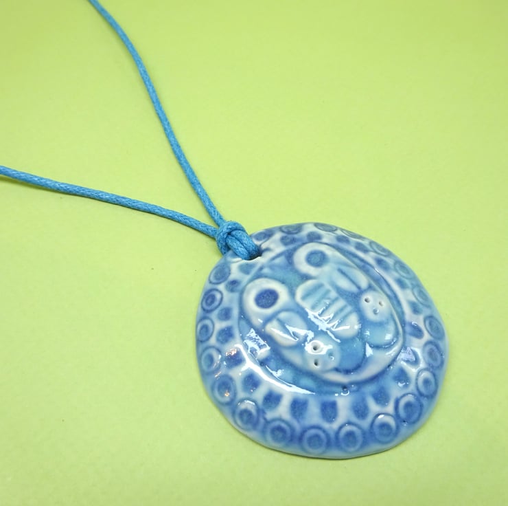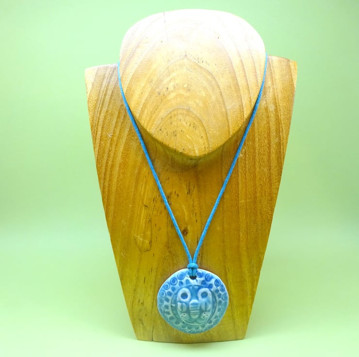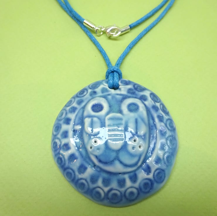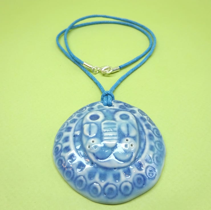 Round pendant in the shape of a stylised lion face. The pendant is a semi porcelain clay that has been pressed into a mold of my own design. The lions face is based on a mid century style, it has been finished with a blue glaze that highlights the details. The teal cord is fastened with a silver plate lobster clasp.