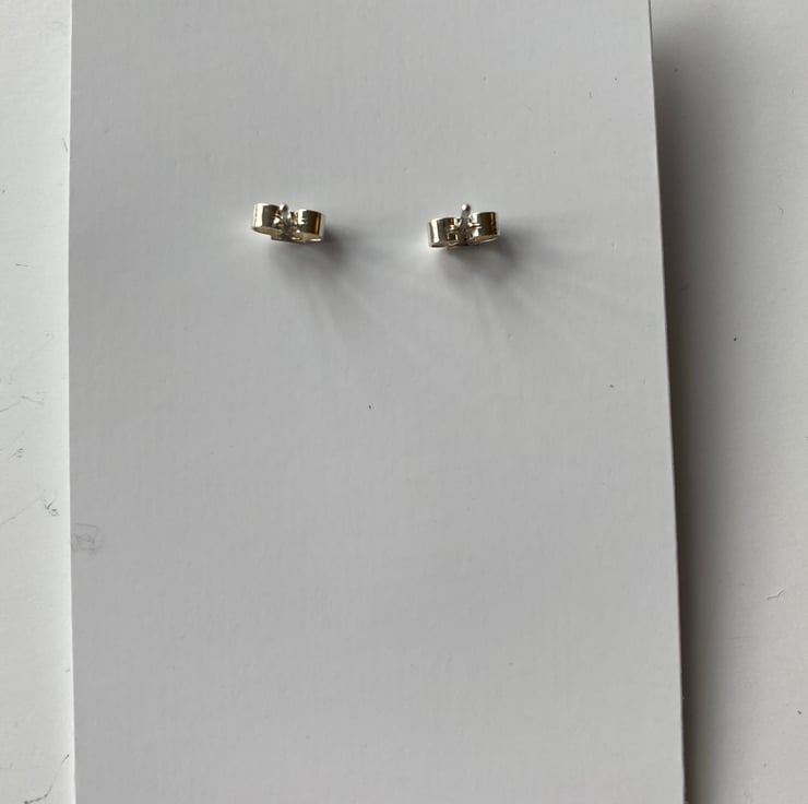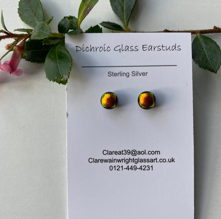 A beautiful pair of fused glass earrings. They have been made using a gold coloured dichroic glass which has a different transmitted and reflected colour giving a gorgeous effect when looked at from different angles .