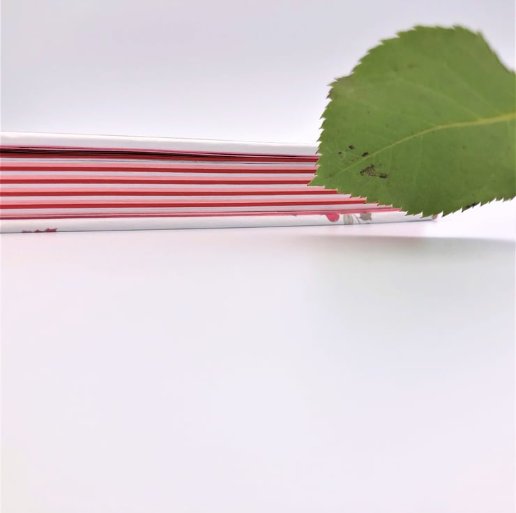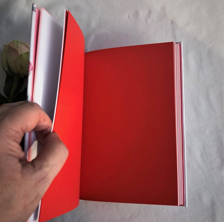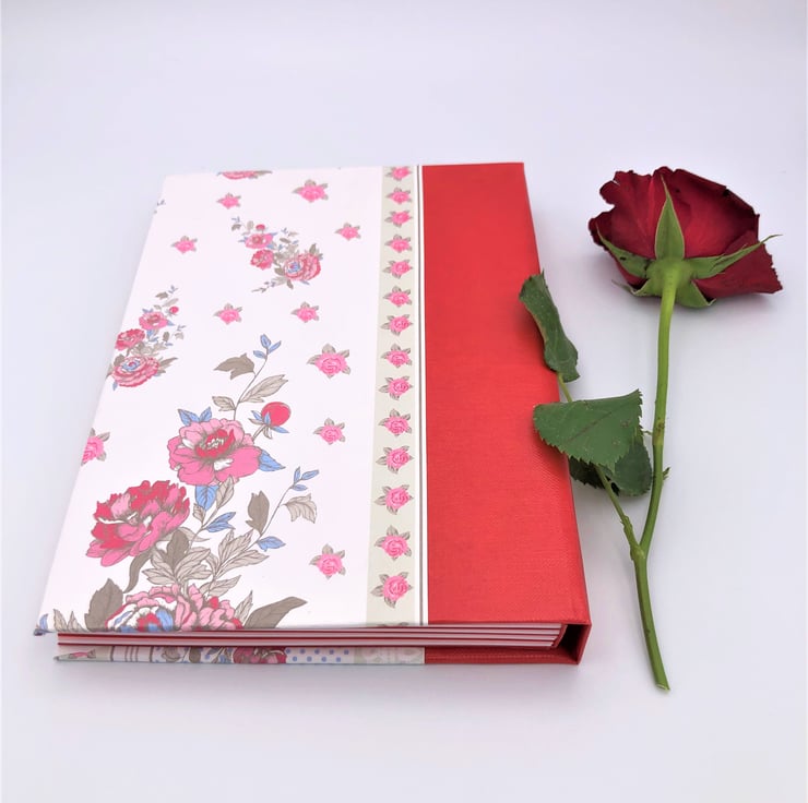A traditionally bound hardback A5 notebook, with red book cloth spine and cover which a design of cascading roses. All books are individually designed, so there are none other like this one!