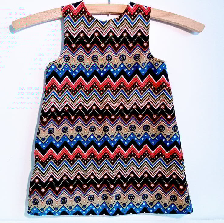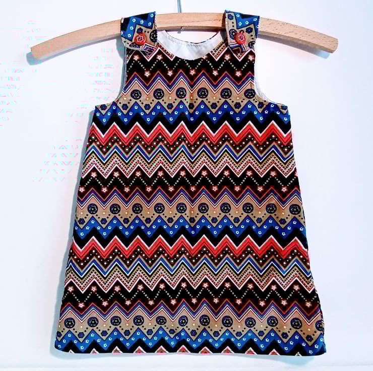 A line style dress/pinafore in needlecord. This dress can be worn by itself or with a long sleeve t shirt as a pinafore, team with warm tights and a cardigan for colder days.