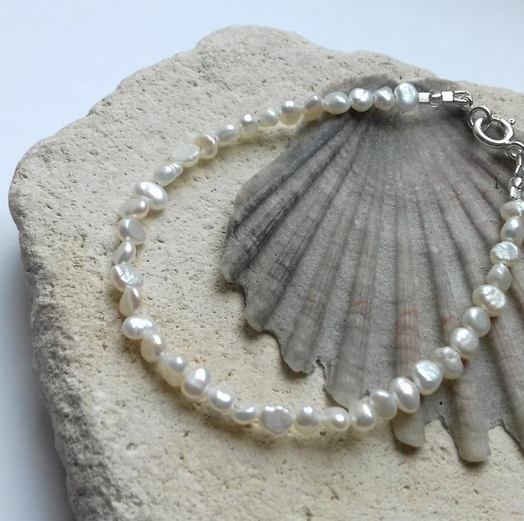 A classic and dainty white freshwater pearl bracelet with a sterling silver bolt clasp.