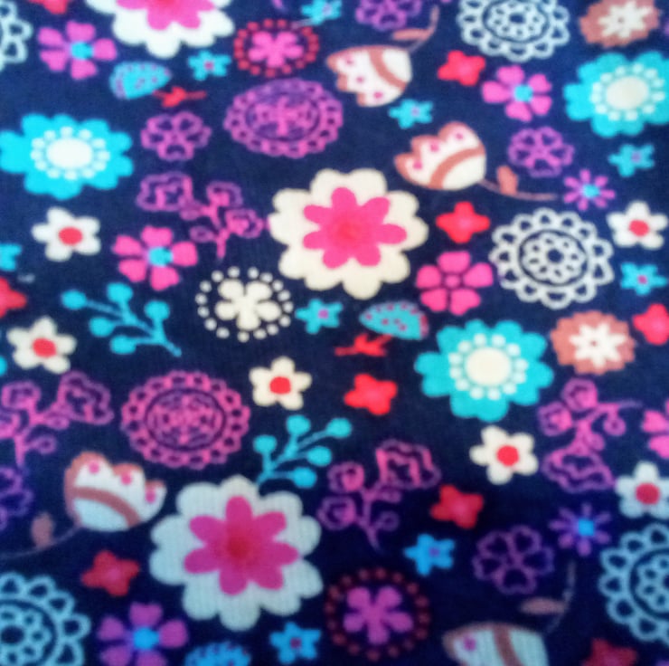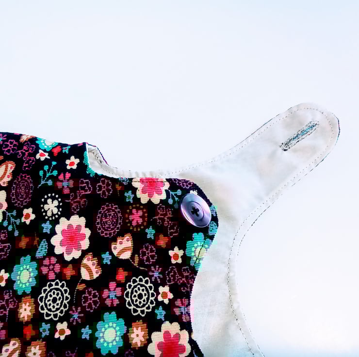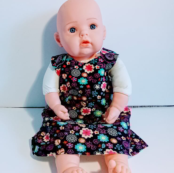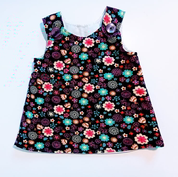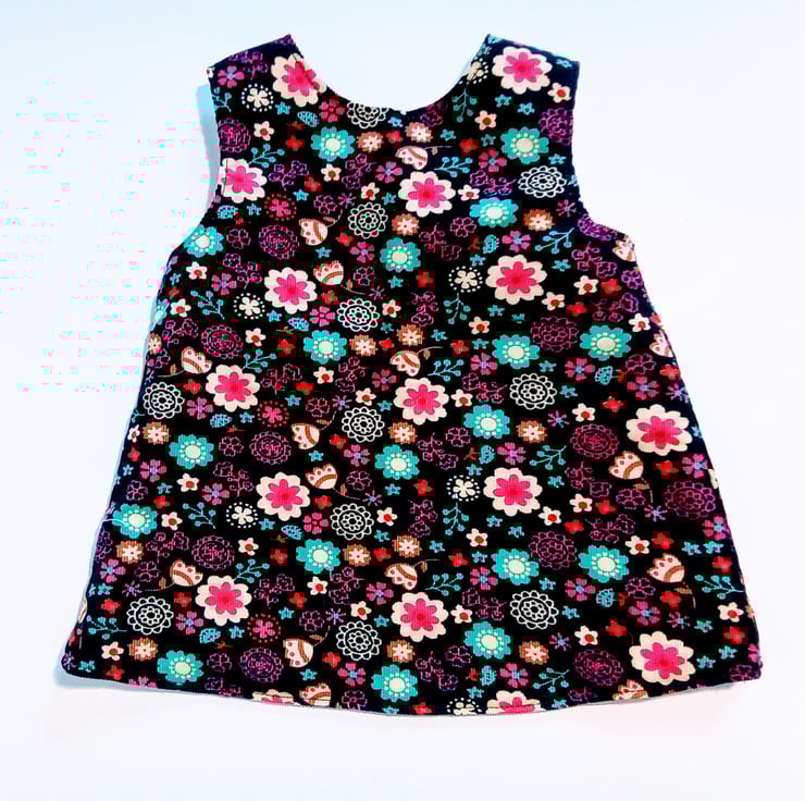 A line style dress/pinafore in a pretty floral design and lined with pale pink polycotton.