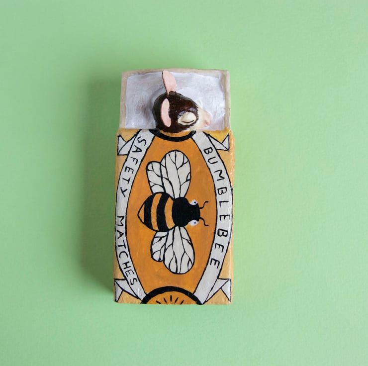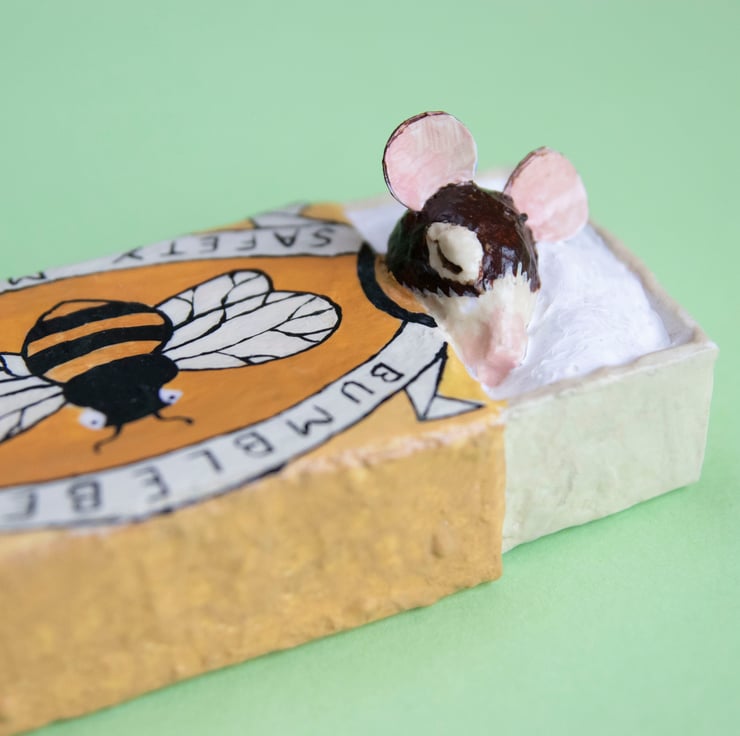 This cute little mouse is napping curled up in a handmade matchbox (measurements approx. 12cmx3cmx7cm) which has been hand painted with a unique design based on real vintage matchboxes. Perfect for a nursery or just a sweet gift for the animal-lover in your life!