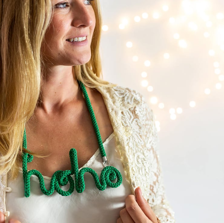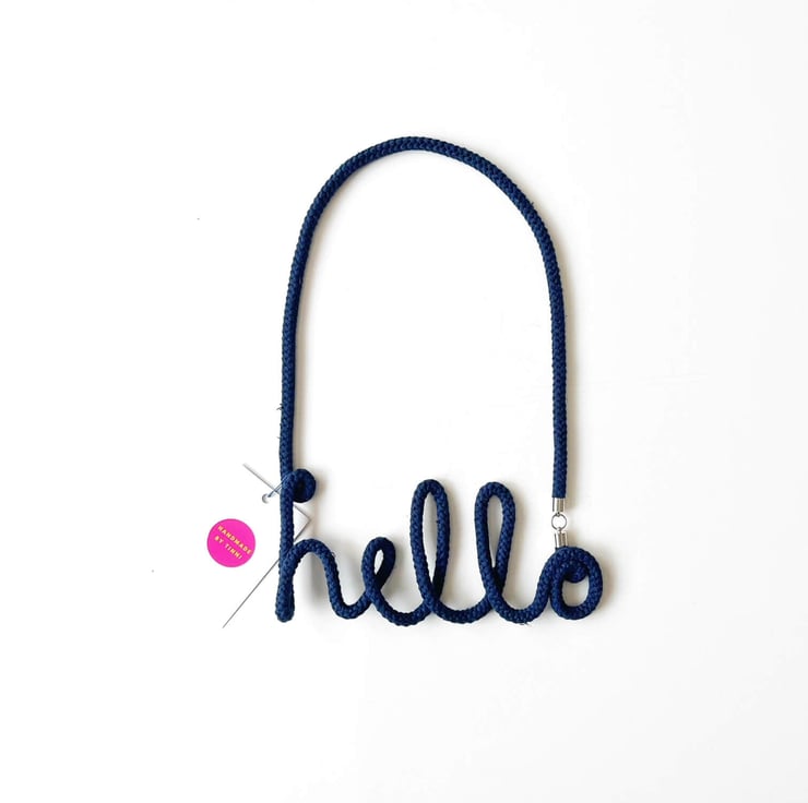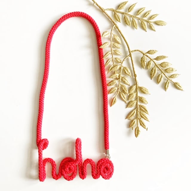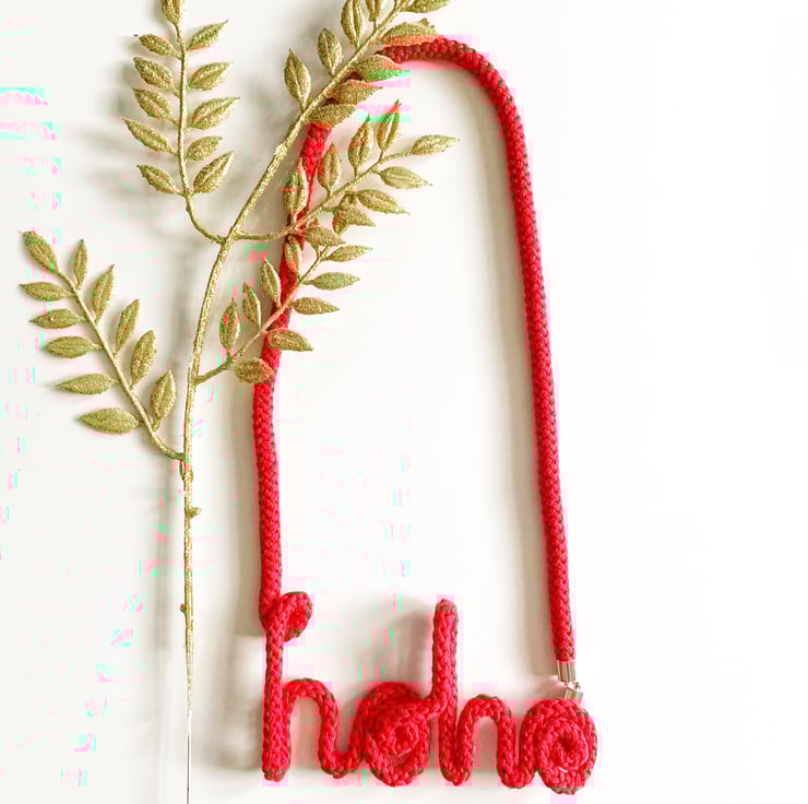 Celebrate in style with this bright red Christmas Necklace with ‘hoho’ spelled out in cotton rope over wire.