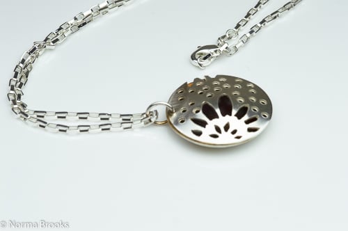 This necklace is made up of two sterling silver discs. I have pierced out a sunflower design from one of the discs then domed both of them. I added a patina to the solid disc and placed underneath the pierce disc. Held in place by a simple jump that acts as a bail for the chain. The patina shows off the piercing beautifully. I have suspend this from an 18 inch long rectangle box chain finished with a trigger clasp. This lovely pendant would make a lovely gift or why not treat yourself !