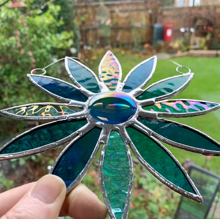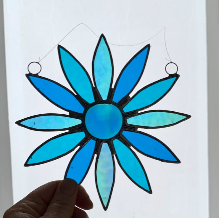 This stained glass daisy suncatcher has been handmade in my studio in West Sussex. No two daisies are the same so this is truly unique piece of glass for your home.