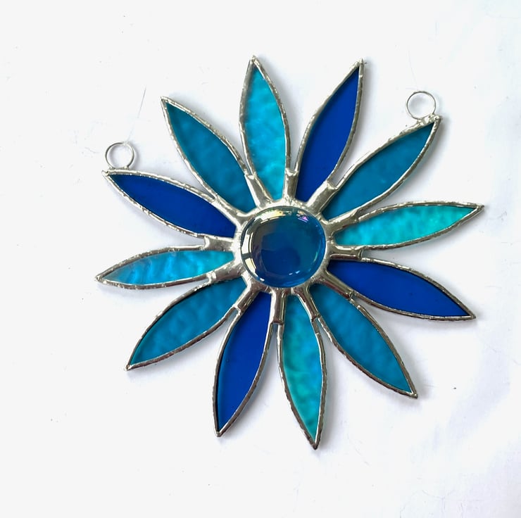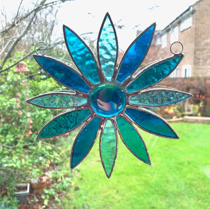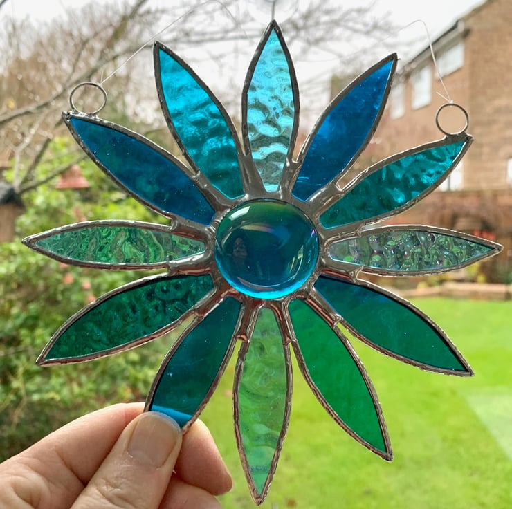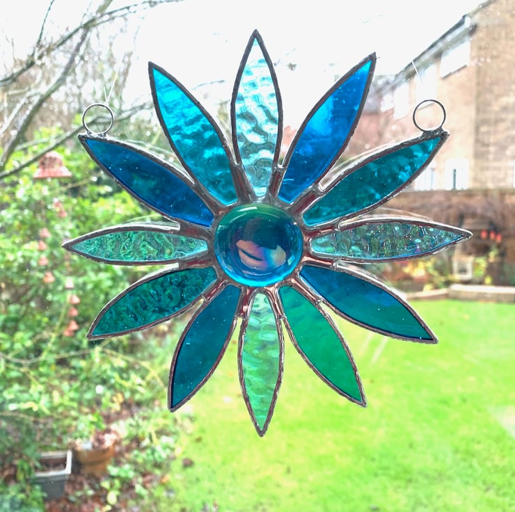 The daisy consists of 12 petals made from 3 different types of turquoise stained glass with a large teal nugget in the middle.