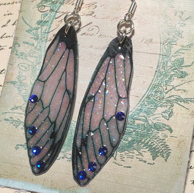 The fairy wings have black veins and are a smoky opaque black. I have added stunning purple Swarovski crystals to each wing. The crystals are amazing and turn from a purple to a cobalt blue and then to a fiery purple depending on how the light hits them.