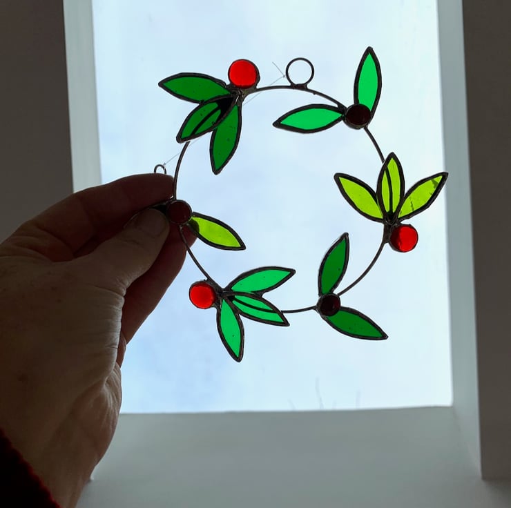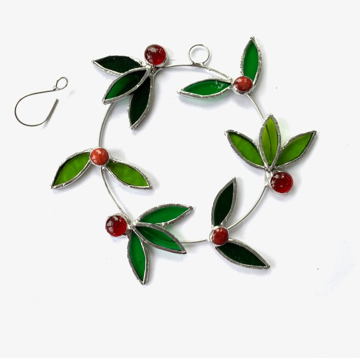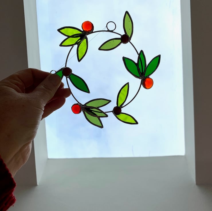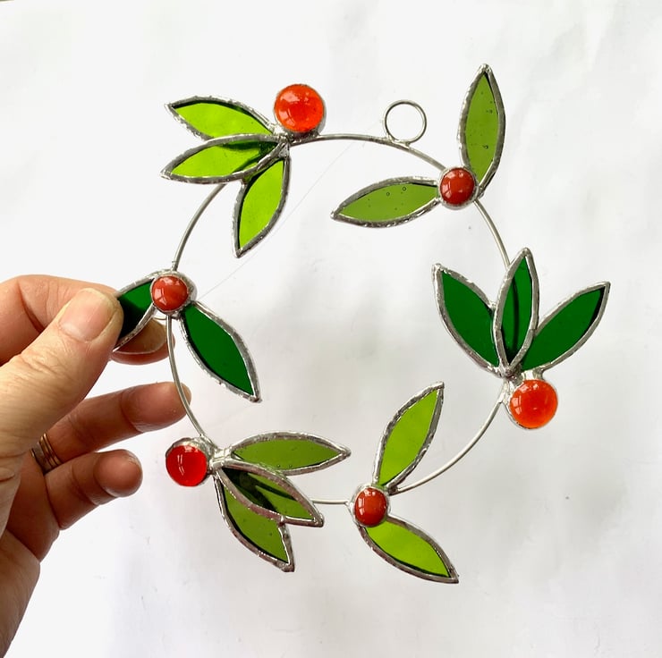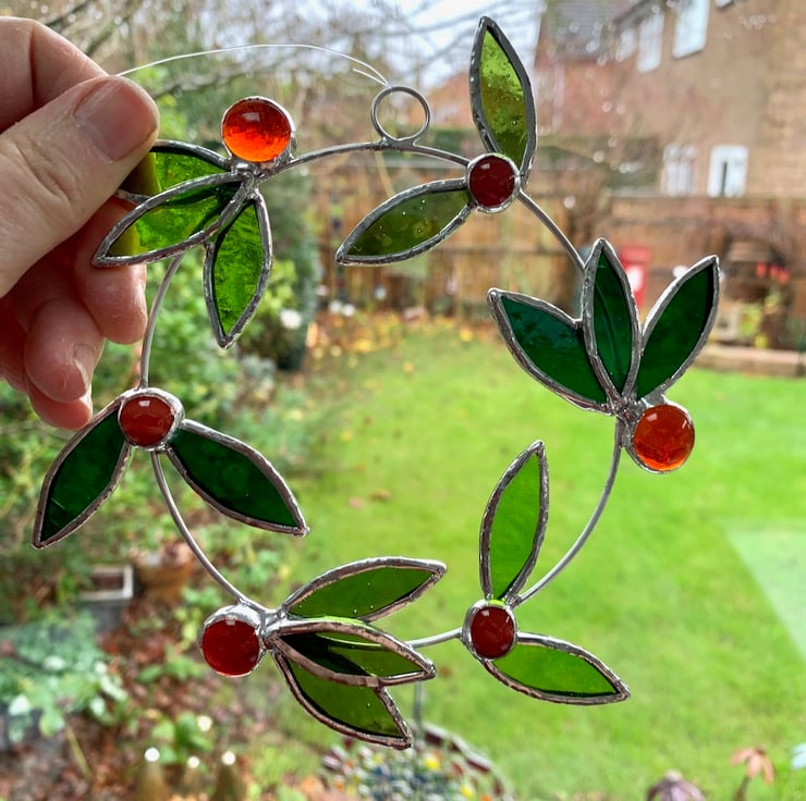 This wreath has been made up from 15 laurel leaves made from 3 different types of green stained glass and 6 red and orange berries. Each piece of glass has been hand cut, ground, washed, foiled and soldered to a ring of tinned copper wire, a ring and hook have been attached for hanging purposes.