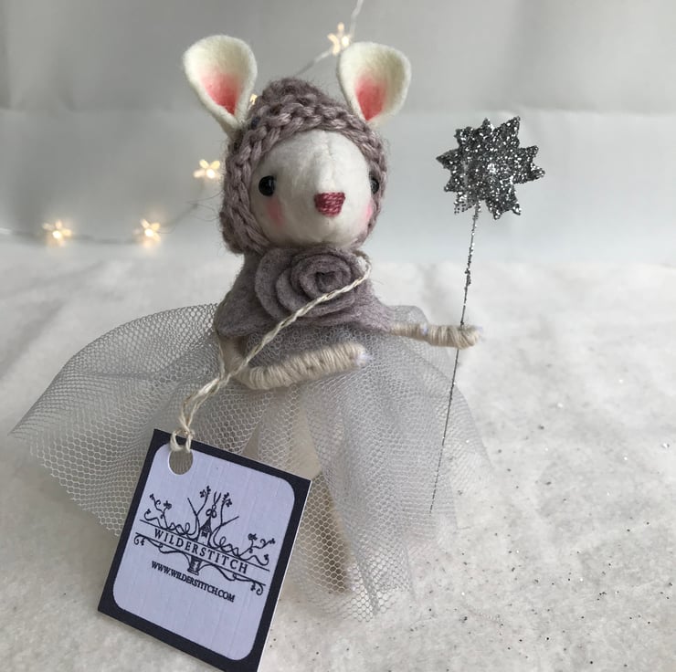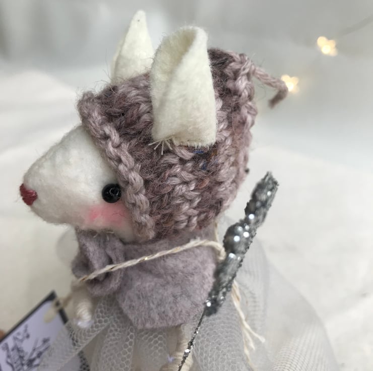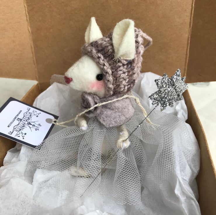 11cm handmade unique mousey decoration. Can sit or stand with a little propping. Will arrive wrapped in tissue in an embossed gift box