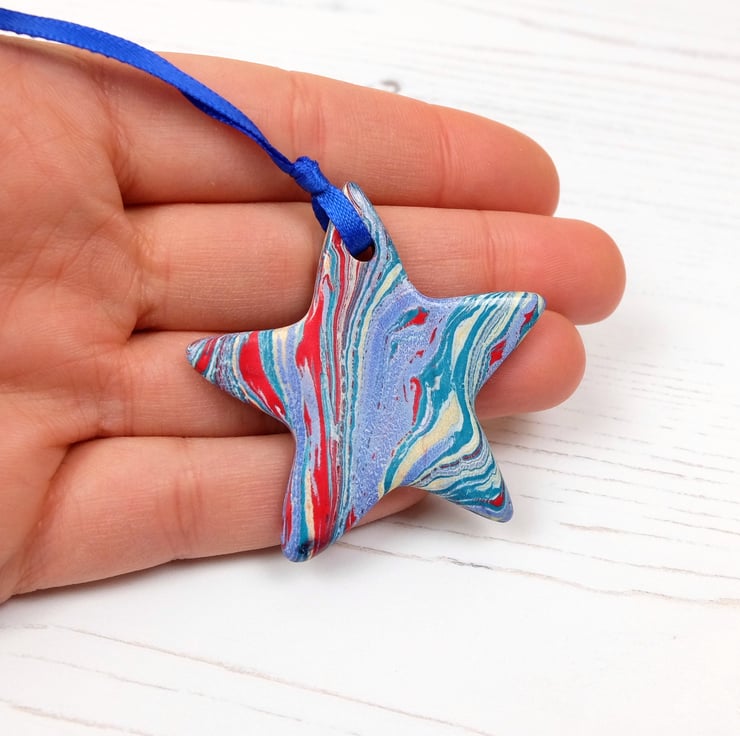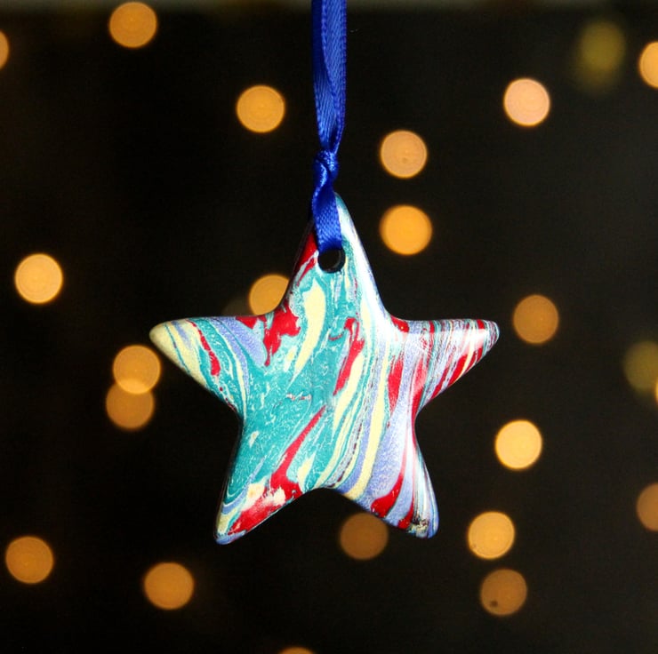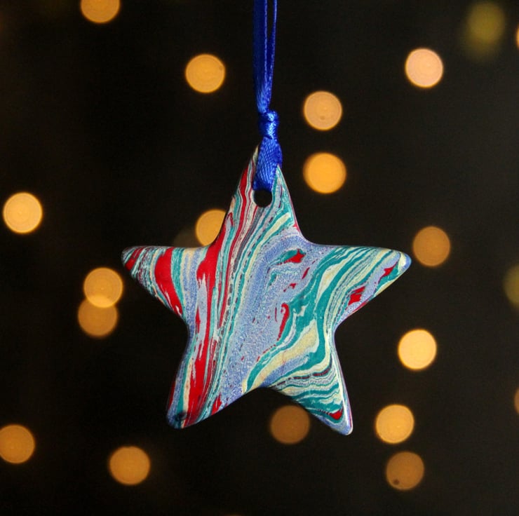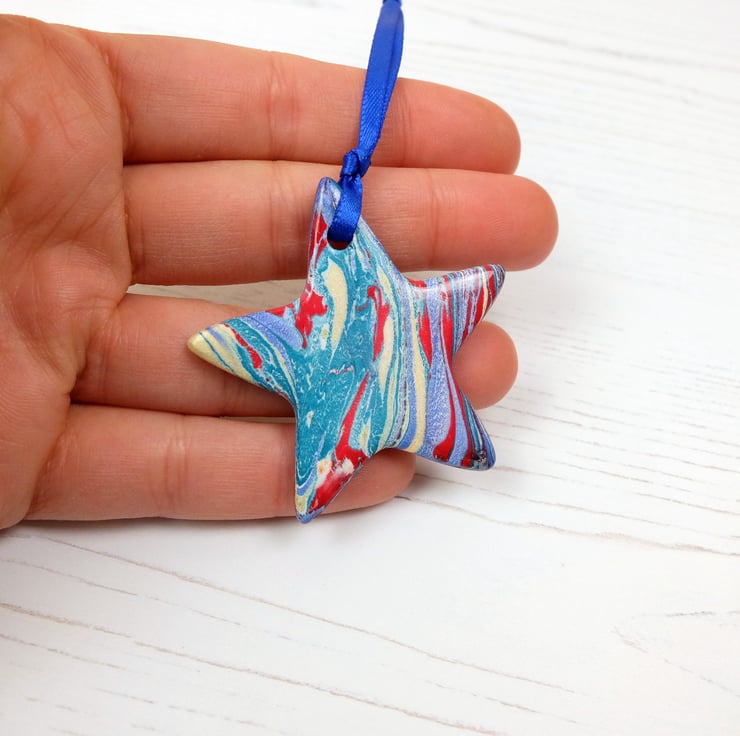 This is a cute little marbled ceramic star decoration in an unusual colour combination of crimson, teal, blue and gold.