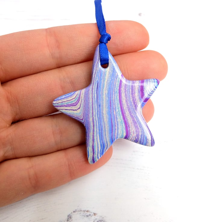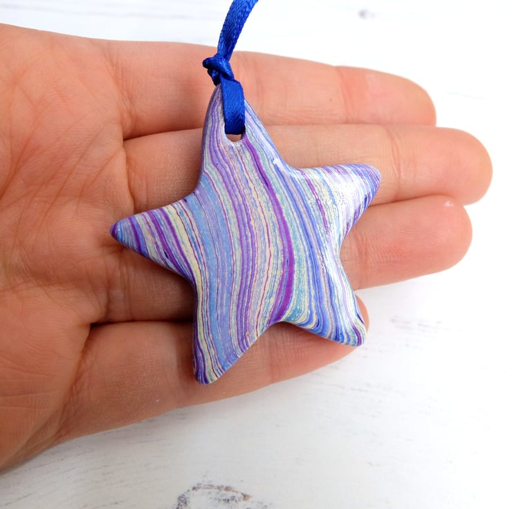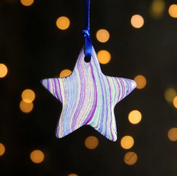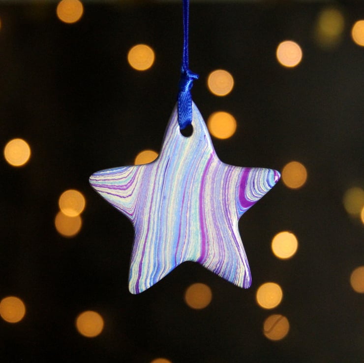 There is a hint of agate about the patterning of this star, it is marbled on both sides and then given a coat of glossy varnish to bring out the depth and shine of the metallic paint.