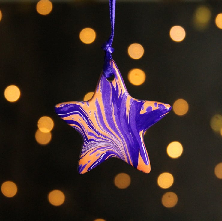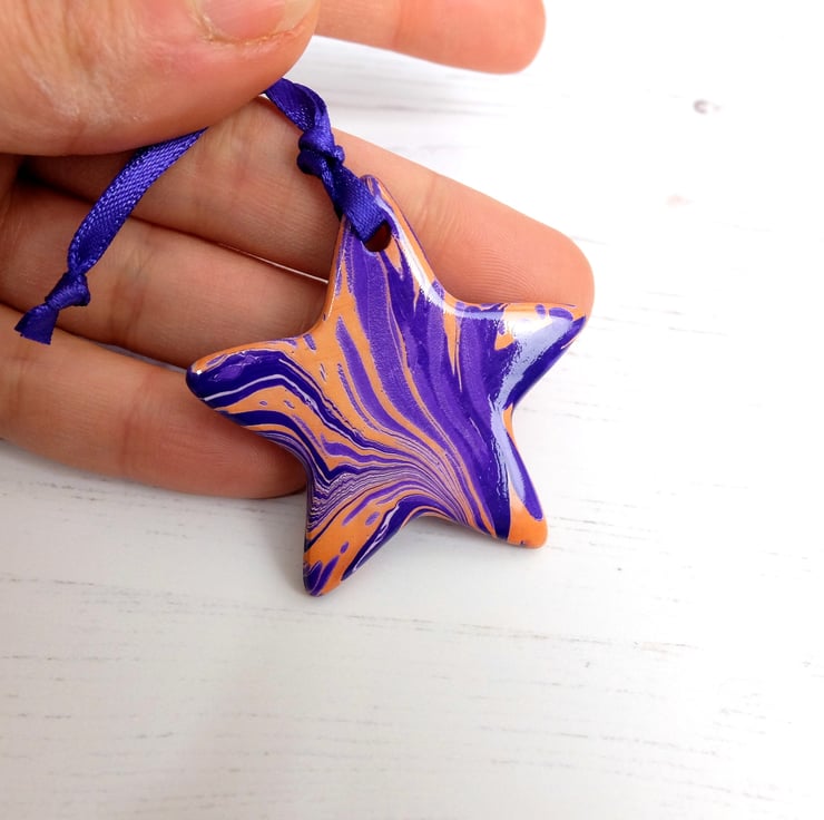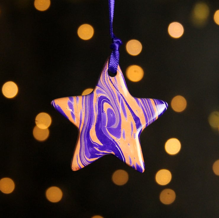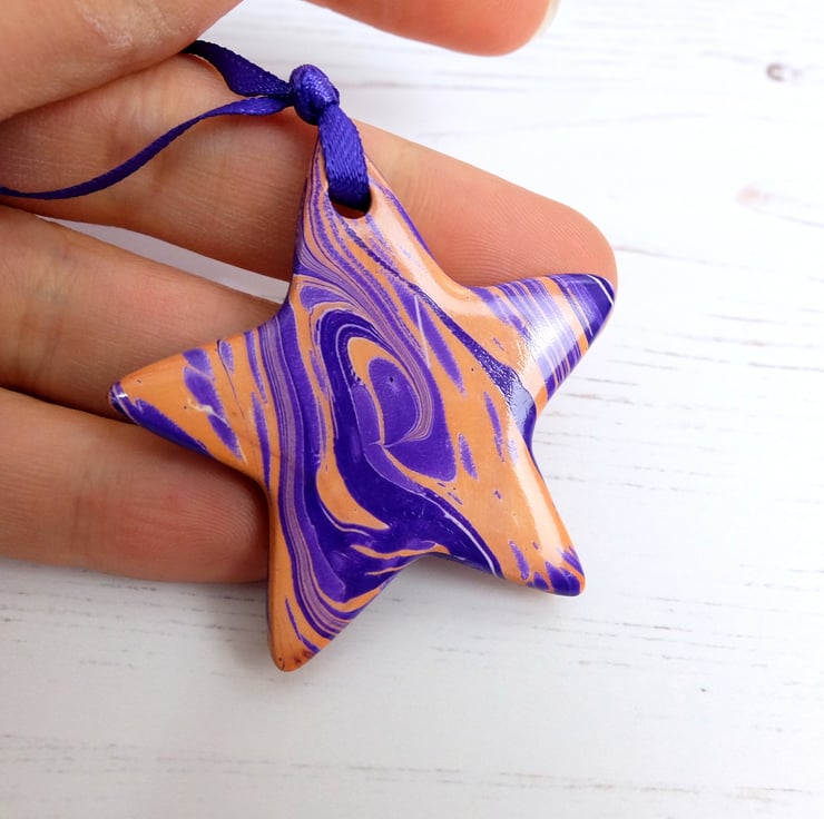 A fun and unusual little marbled ceramic star in a purple and coral/peach colourway. One side has a little swirl in the centre.