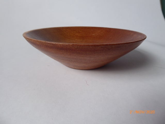 This shallow little bowl is hand turned using Chafuta wood. 140 mm diameter x 40 mm high.