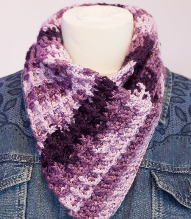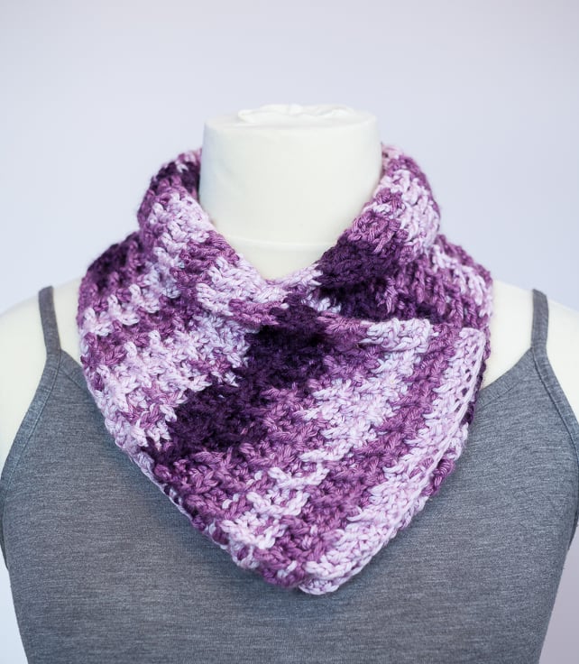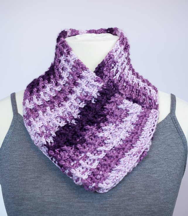 I have crocheted this cowl using Caron simply soft ombre in grape purple.