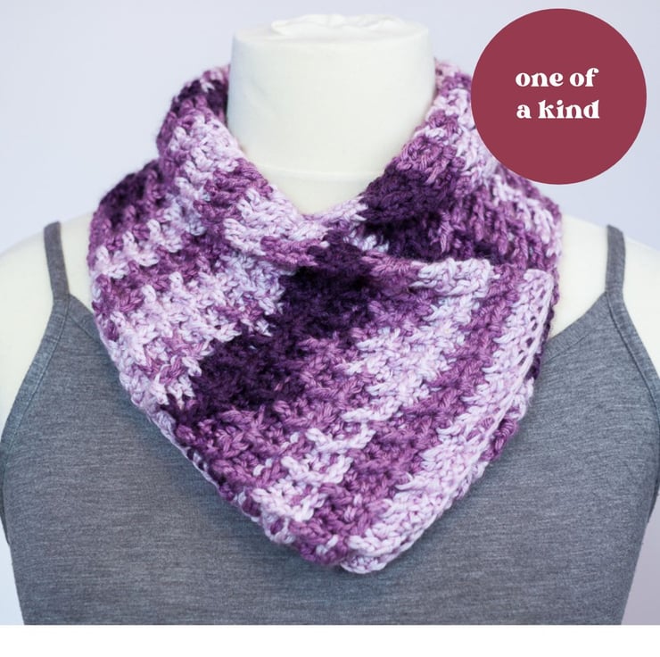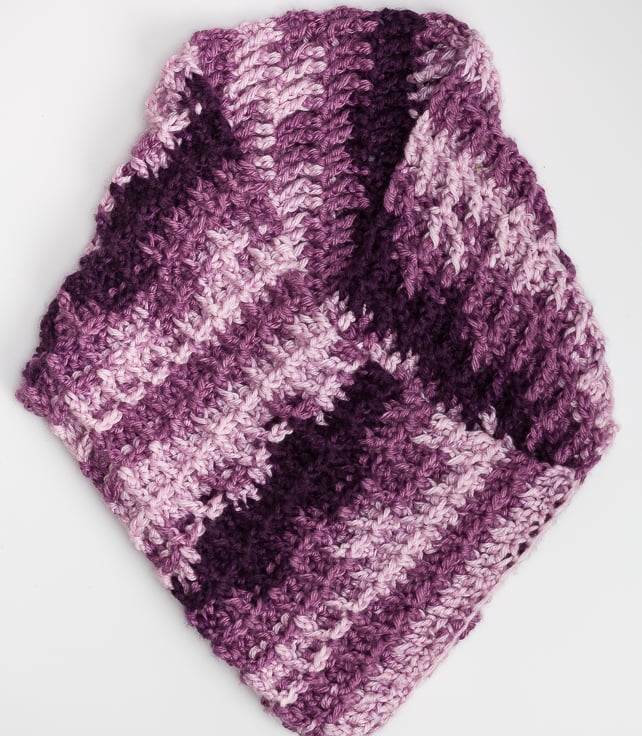 It is crocheted using the waffle stitch which creates a dense, warm cowl.