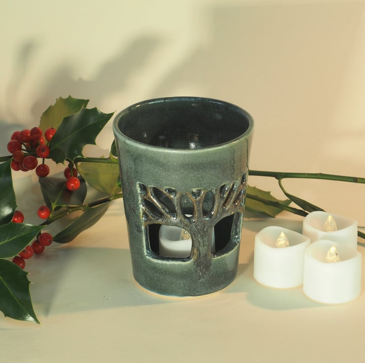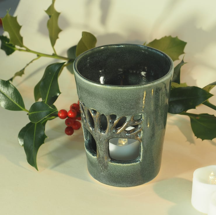 This candle holder has been thrown on the wheel and a tree of life design carved into it by hand when it is at the leather hard stage. Finished in a grey-green shiny glaze, with the tree highlighted using iron oxide.