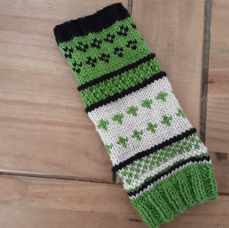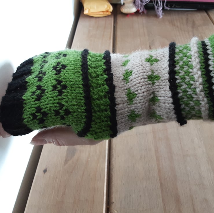 Fair isle fingerless gloves, warm and cosy in vegan yarn. Over wrist length. Hand made