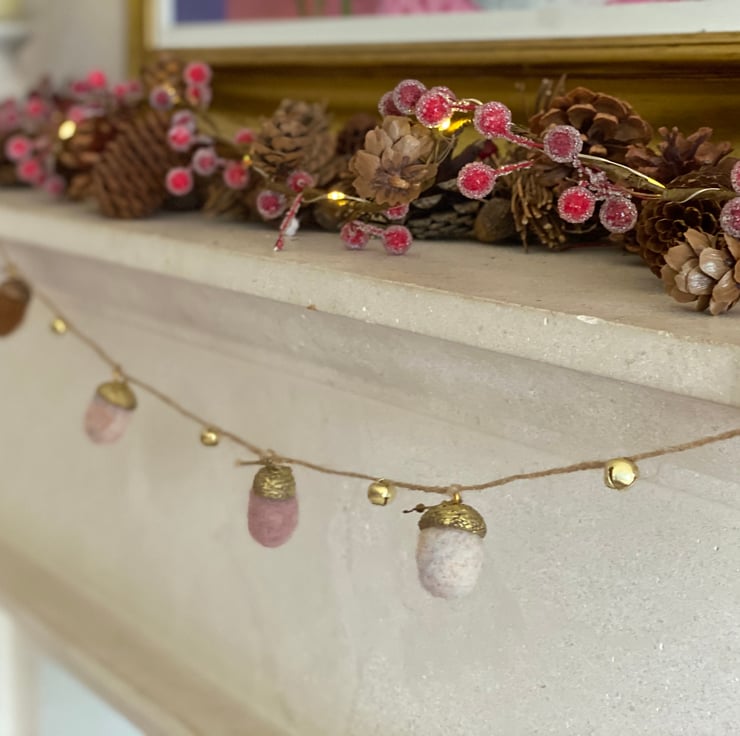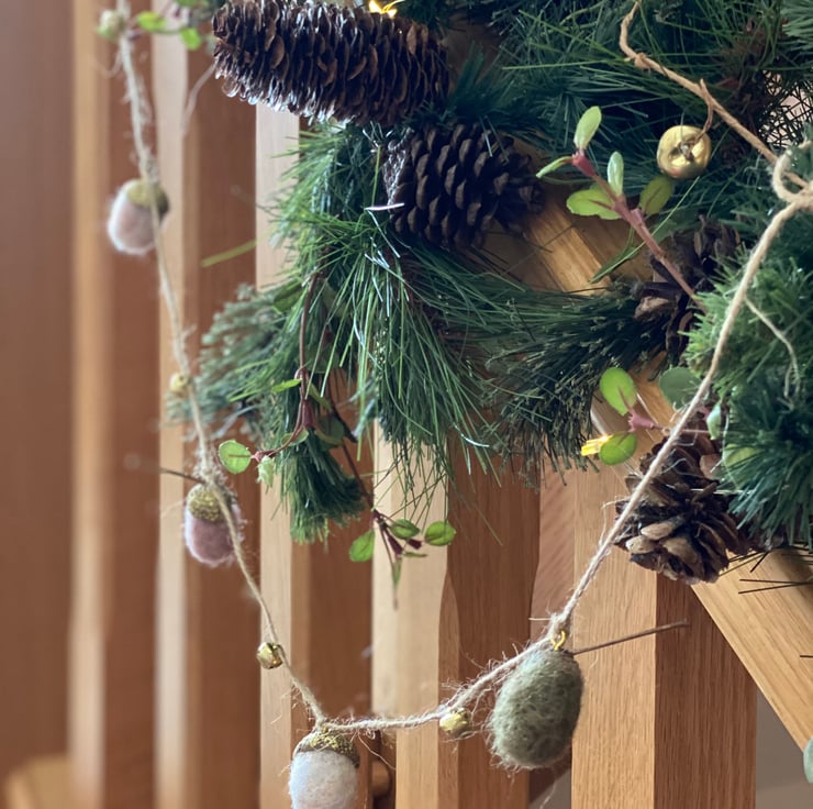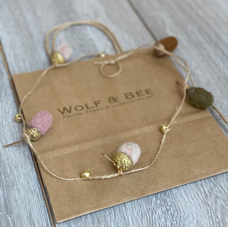 Pretty garland handmade using needle felting with sustainably sourced wool, foraged acorn cups, natural twine and a little, tinkling bell.
