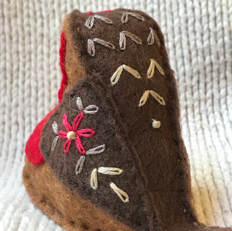 This friendly little bird was carefully stitched and embroidered onto soft polyester felt. There are sequins for the eyes, a bill made from ribbon stiffened with nail varnish and little ceramic bead details.