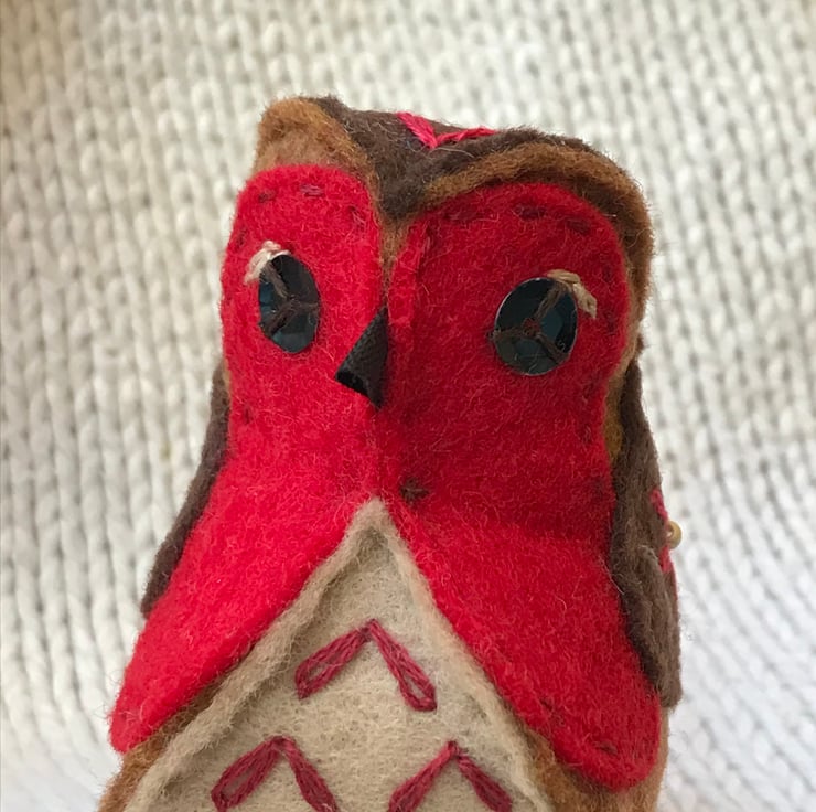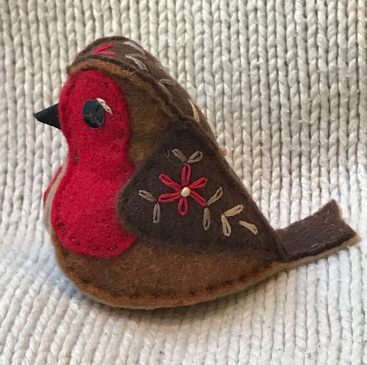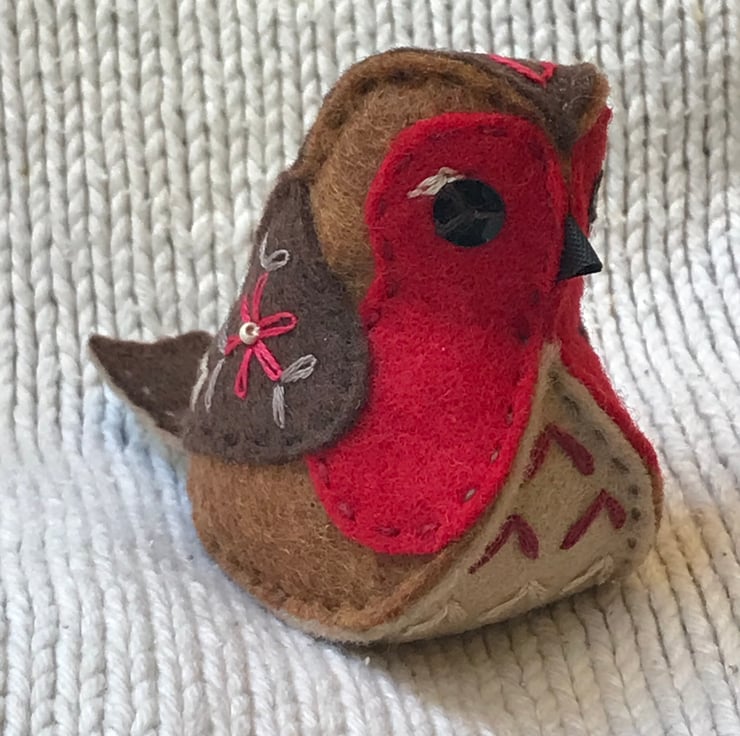 Exact colours and embroidery may vary, as each Robin is handmade. Ready for a new home