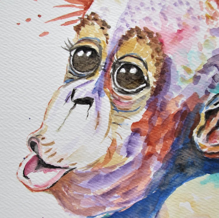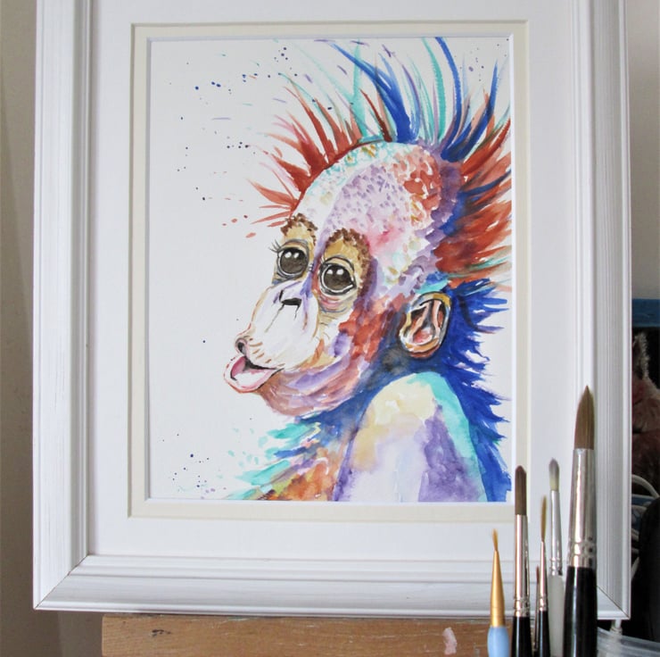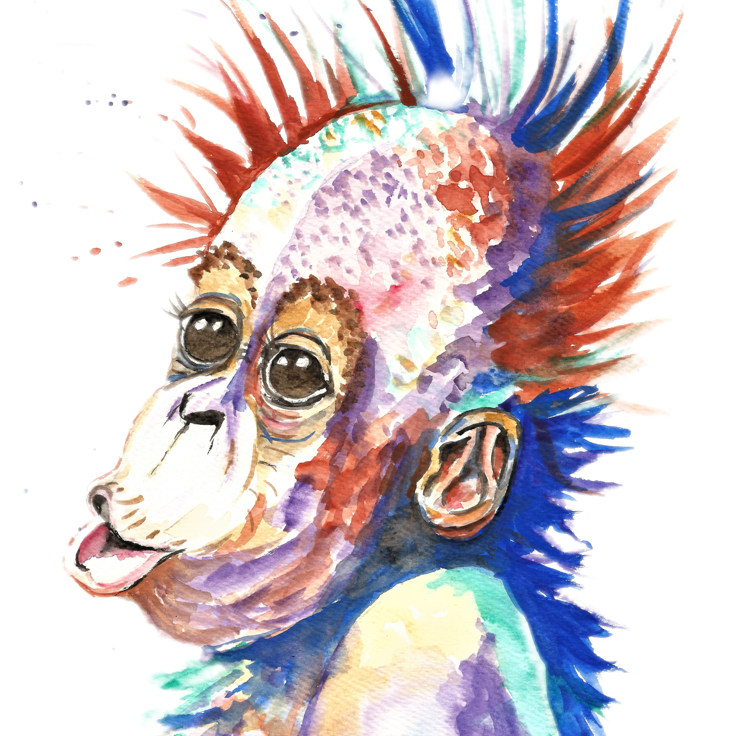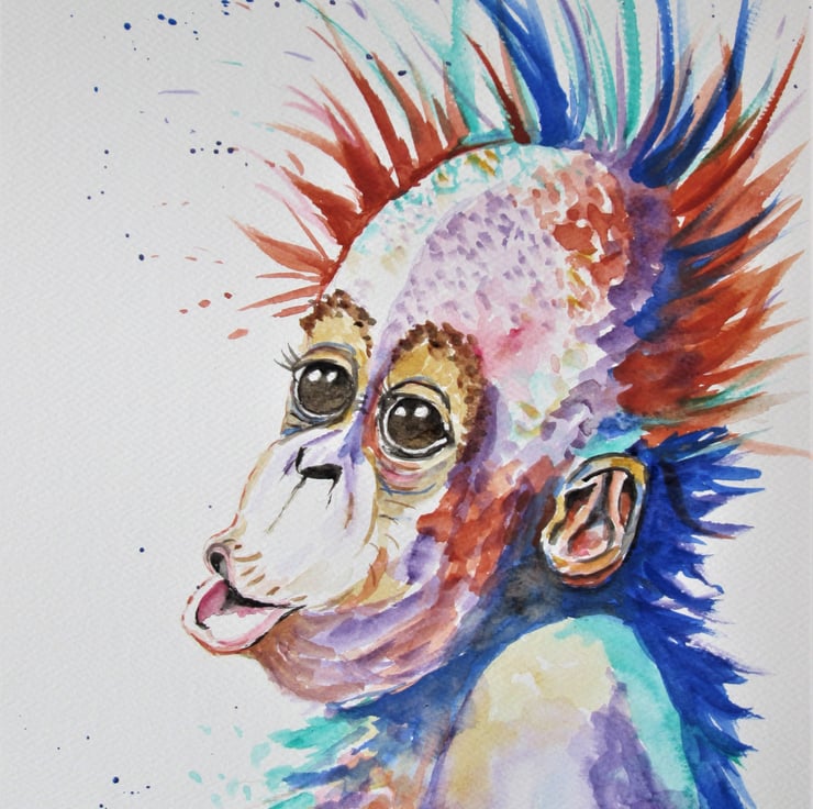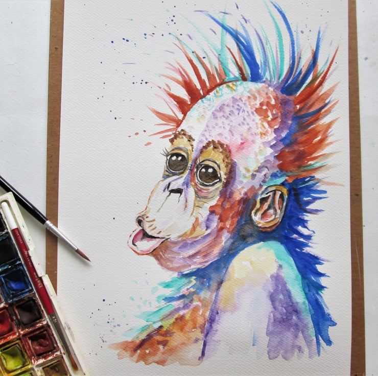 A watercolour painting of a lovely colourful orangutan is featured here.