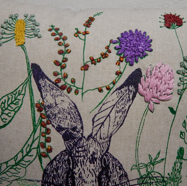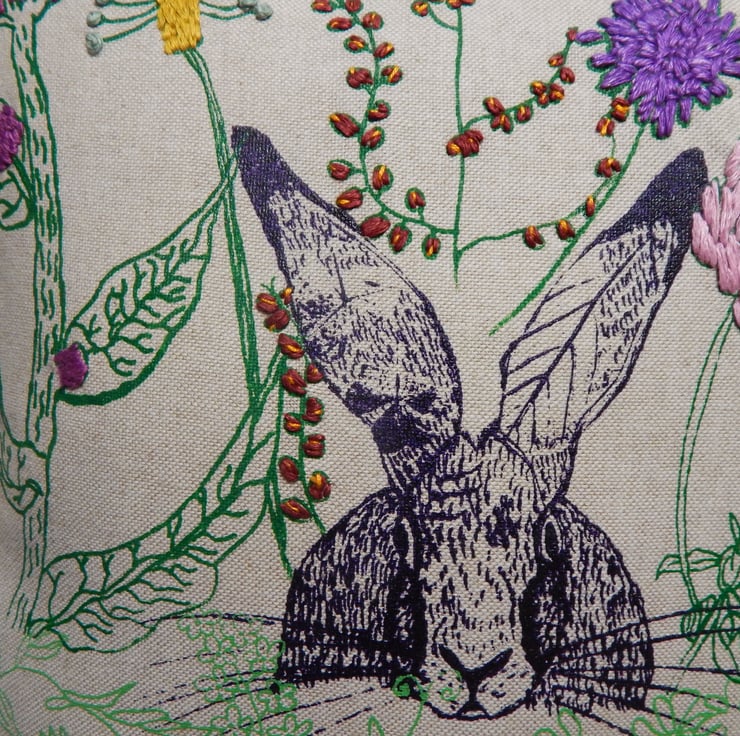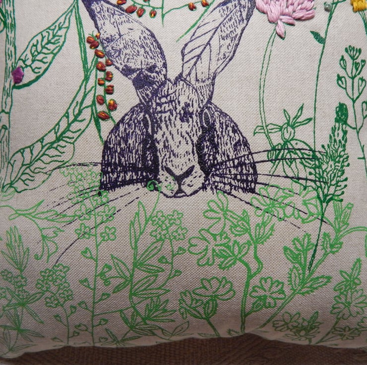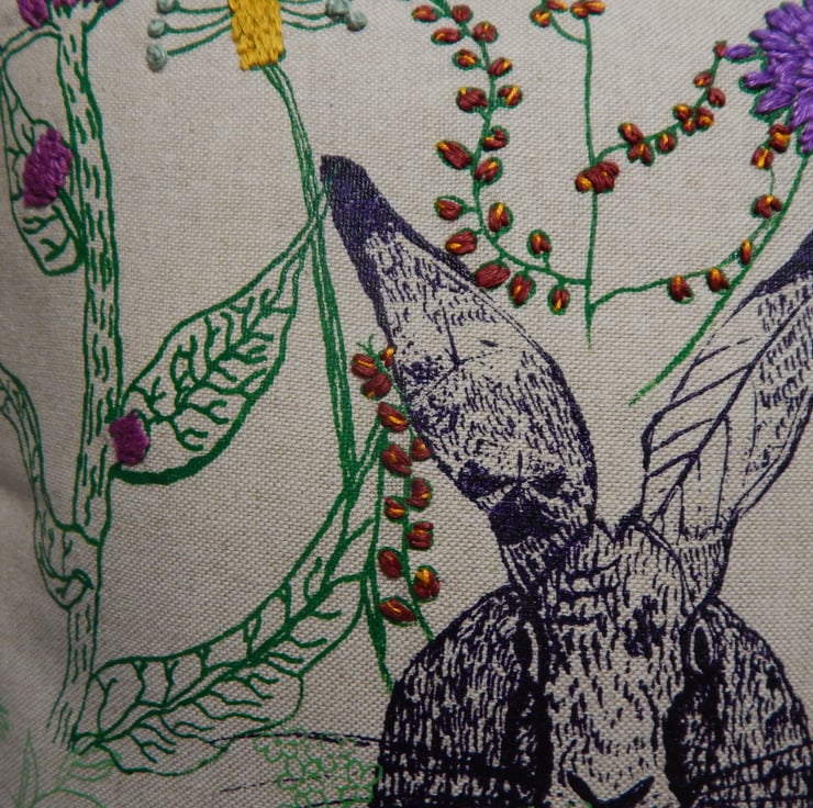 The cotton is a beige colour and I have screen printed by layering different designs in green and purple for the hare. Several plants have been hand embroidered just to make them pop a little. The reverse of the cushion has my pink campion design on it in green.
