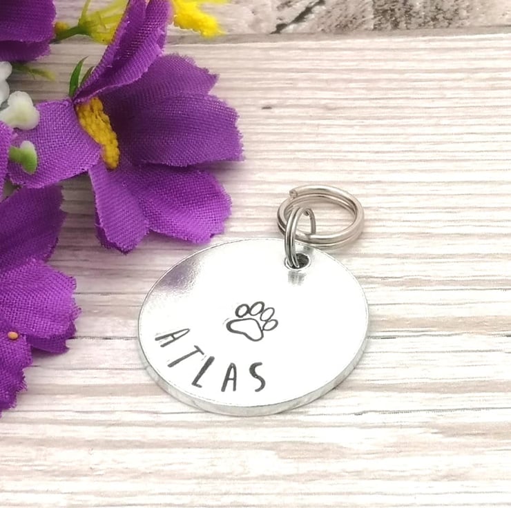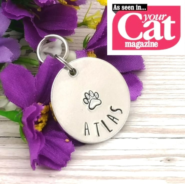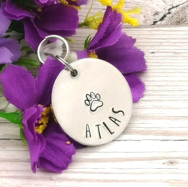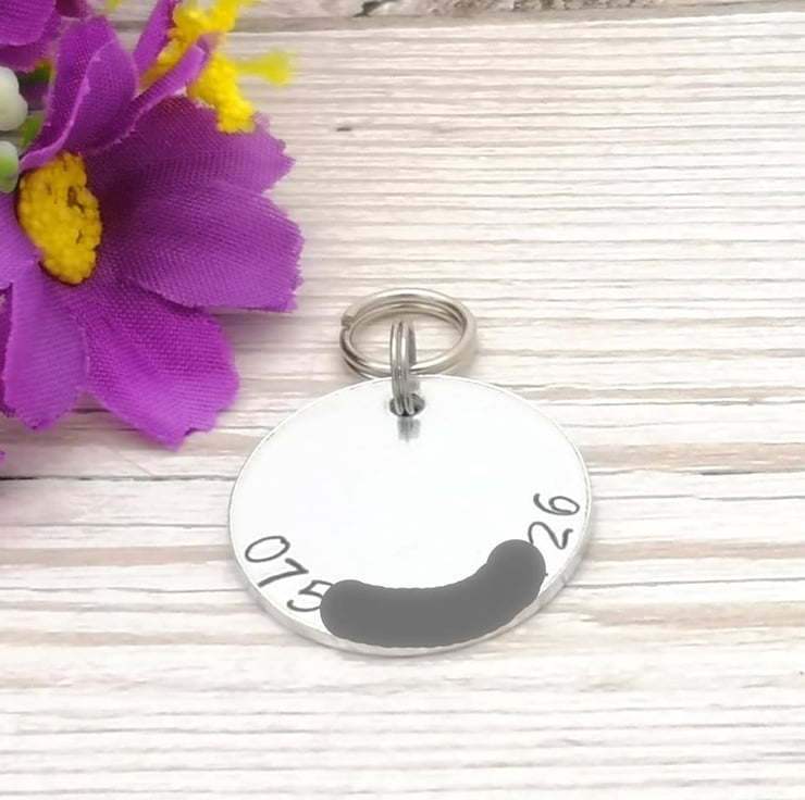 This cute pet ID tag will be made to order by hand stamping each individual letter and number onto a blank piece of aluminium metal. It is then polished, painted with black ink and finished with a protective thin layer of wax.