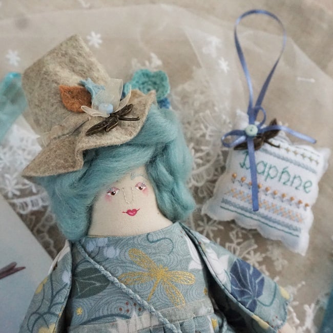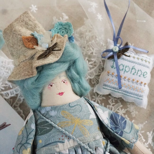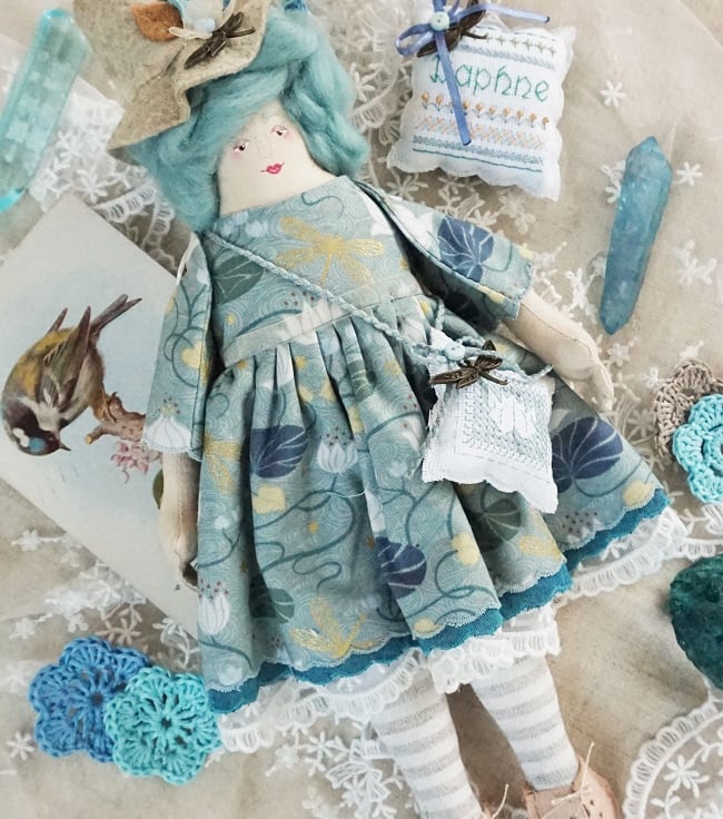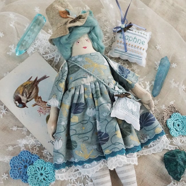 Daphne is a little witch doll made to my own doll pattern here in Lancashire. She has a hand painted, hand embroidered face with soft aqua wool tops for hair. Daphne is firmly stuffed with sage in her stuffing for a gentle scent and a piece of rock crystal at her heart.