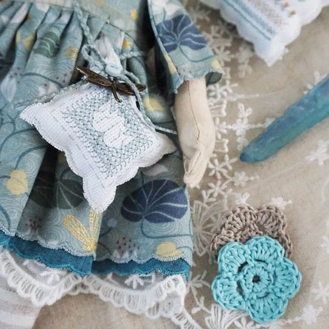 She is dressed in Jardin de Lis, a wonderful rich Lewis and Irene print in shades of aqua, pale yellow and teal and finished with a yellow organza ribbon. Her outfit is completed with tiny buttons, leather shoes and an assisi work water lily on her little sachet. She has coordinating knickers and underskirts in cotton and lace.