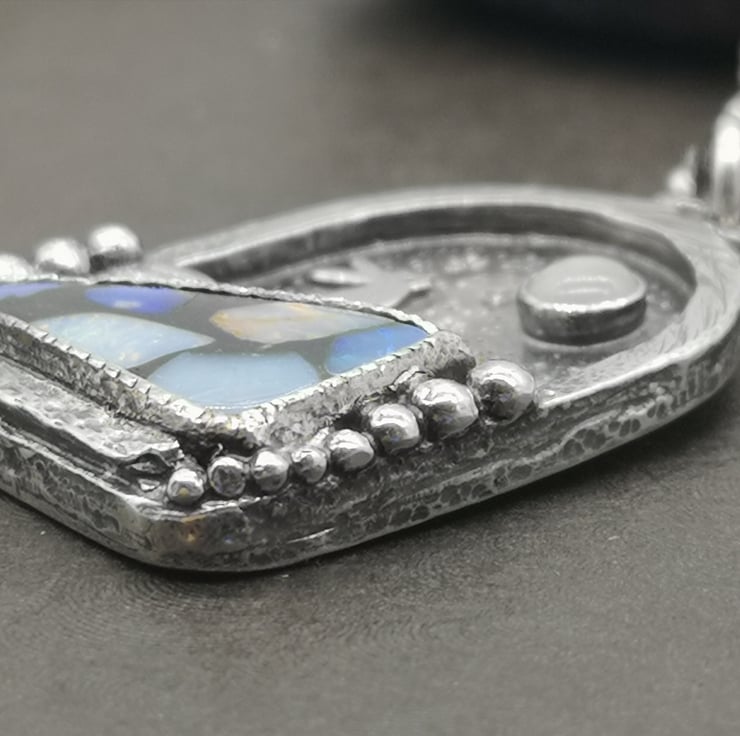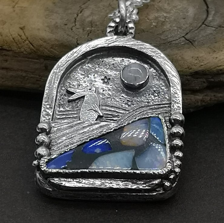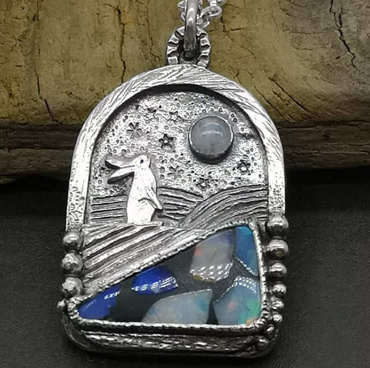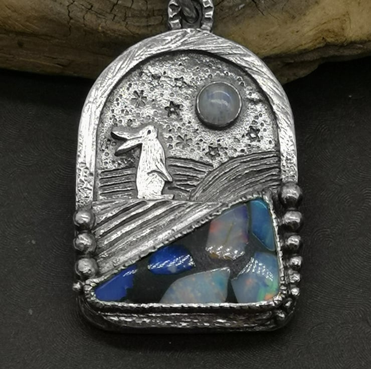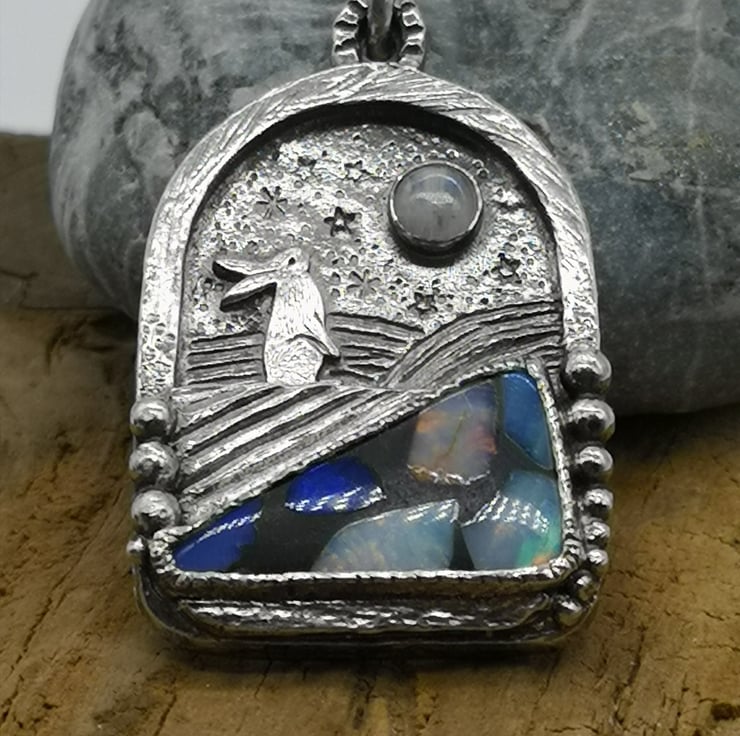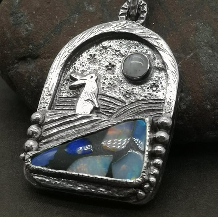 Made using traditional jewellery making techniques using my jewellers saw, metal stamping, hand engraving, soldering. I have set an opal mosaic doublet and moonstone onto this pendant to create the feeling of a landscape with a little hare gazing at the night sky.