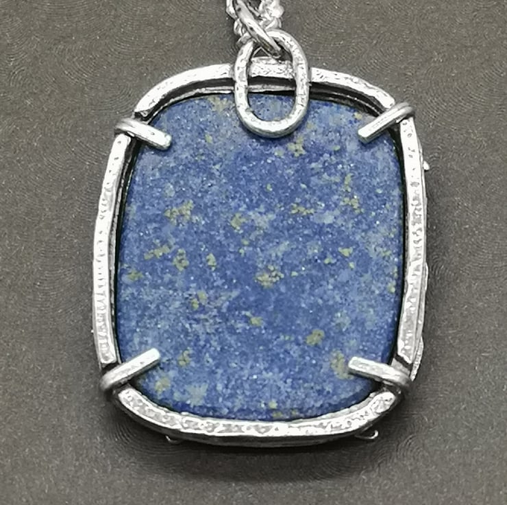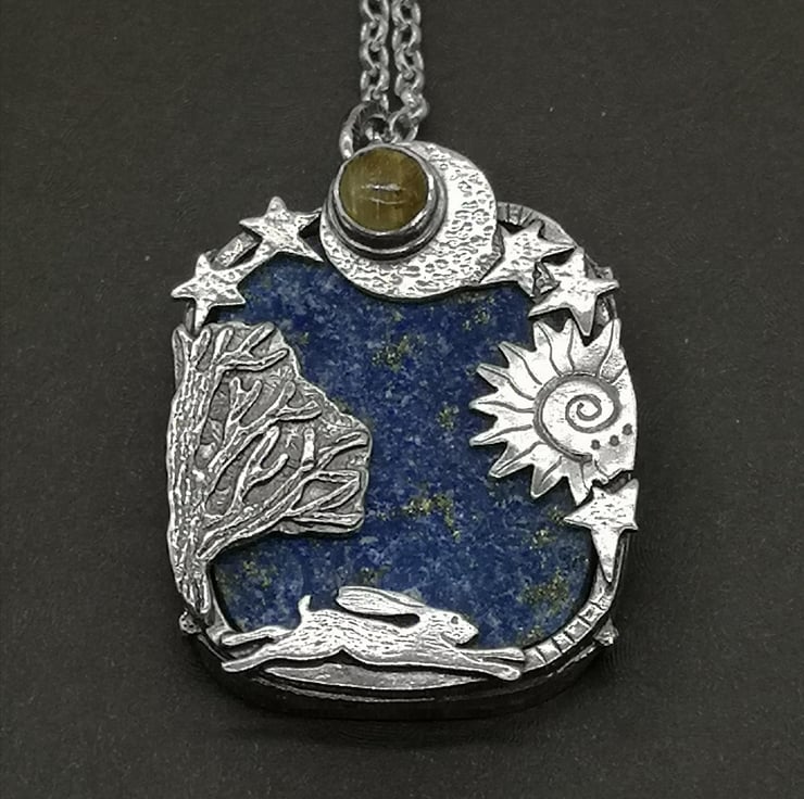 Made using traditional jewellery making techniques, I have made this pendant setting a beautiful rough faced lapis lazuli stone into a sterling silver frame along with a golden rutile quartz stone. With hare, tree, moon, sun and star detail.