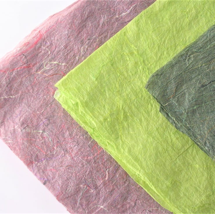These are full sheets of natural eco paper akin to soft, thick, flexible, tissue paper featuring clearly visible mulberry tree fibres. The base of this silk paper comes from the fast-growing shoots of the mulberry tree and is produced by artisans in a traditional, sustainable way.