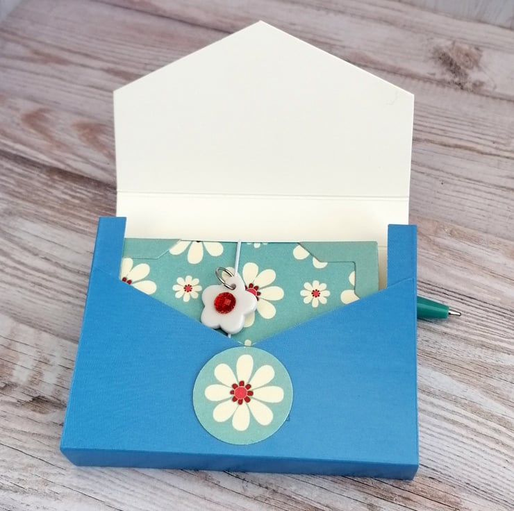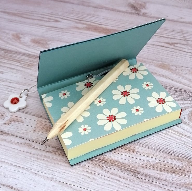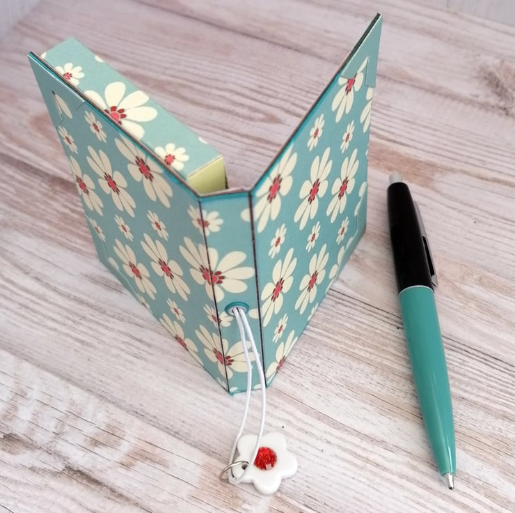 This mini notepad is made from upcycled packaging covered in a blue and white daisy design paper. It is held closed with an elastic fastening embellished with a white and red flower bead . It makes a perfect stocking filler or teacher gift and is ideal for keeping in your handbag or pocket