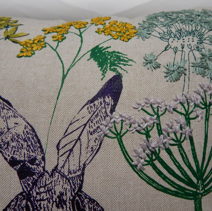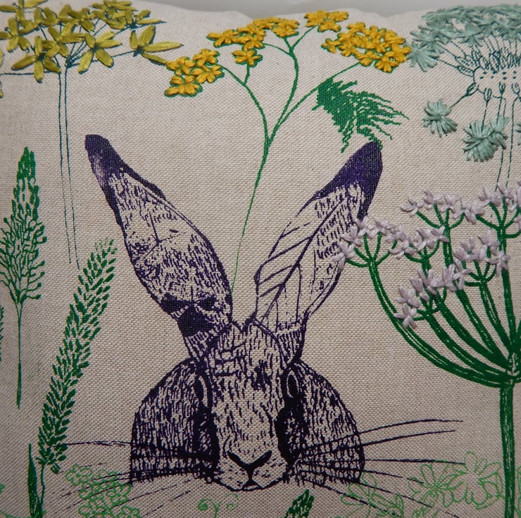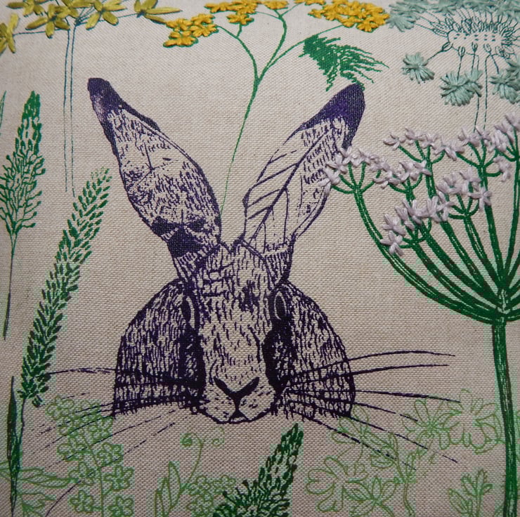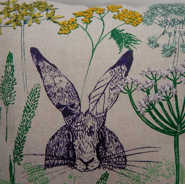 The cotton is a beige colour and I have screen printed by layering different designs in green and purple for the hare. Several plants have been hand embroidered just to make them pop a little. The reverse of the cushion has my hedgerow design.