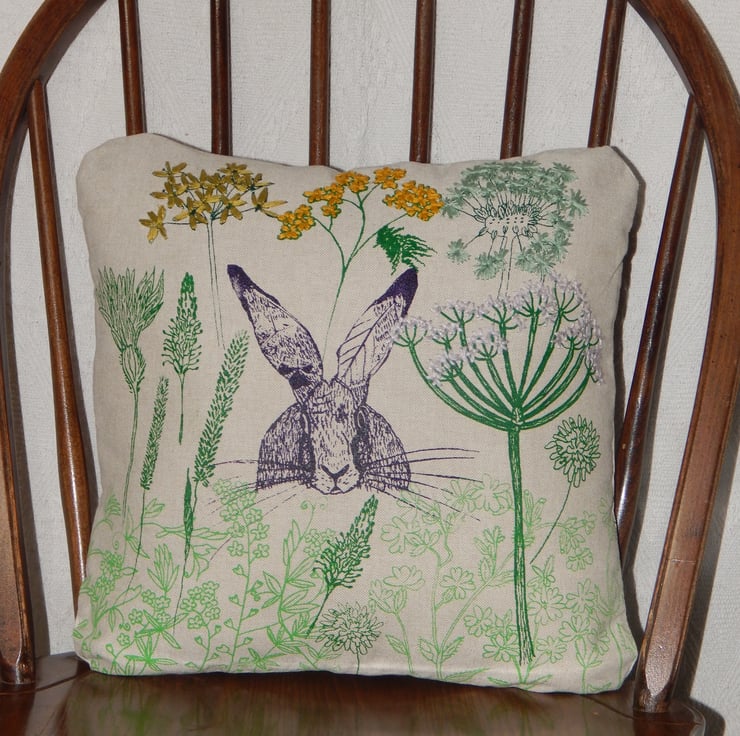 This is a cotton cushion that I have screen printed with a Hare in the Hedgerow. the Hare is printed in a purple and his ears are patterned with leaves that were in the area of the hare that I photographed to use for a screen design. To the base of the hare are forget me not and pink campion flowers. Around him are cow parsley, dandelion clock, yarrow, plantain, wild garlic and grasses. It is an envelope style back with poppers. The cushion measures 32cm in length by 32 cm in width.