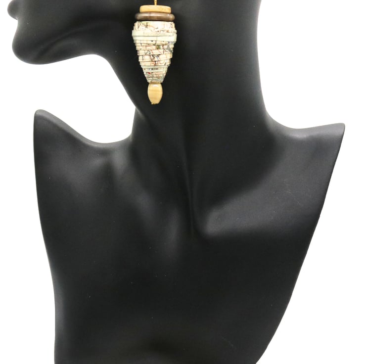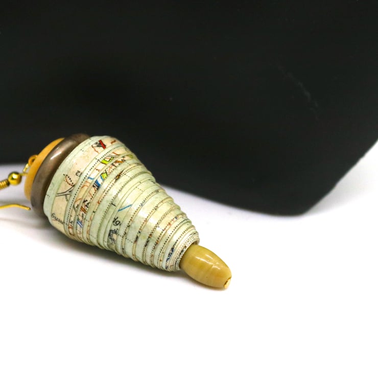 Despite its age, the map had very vivid colours but when hand rolled into cones, the predominant effect was subtle hues of cream, blue and pale green. The paper beaded cones were therefore complemented with an oval cream bead at the tip and preloved taupe shiny flat bead and preloved cream wood flat bead at the top.