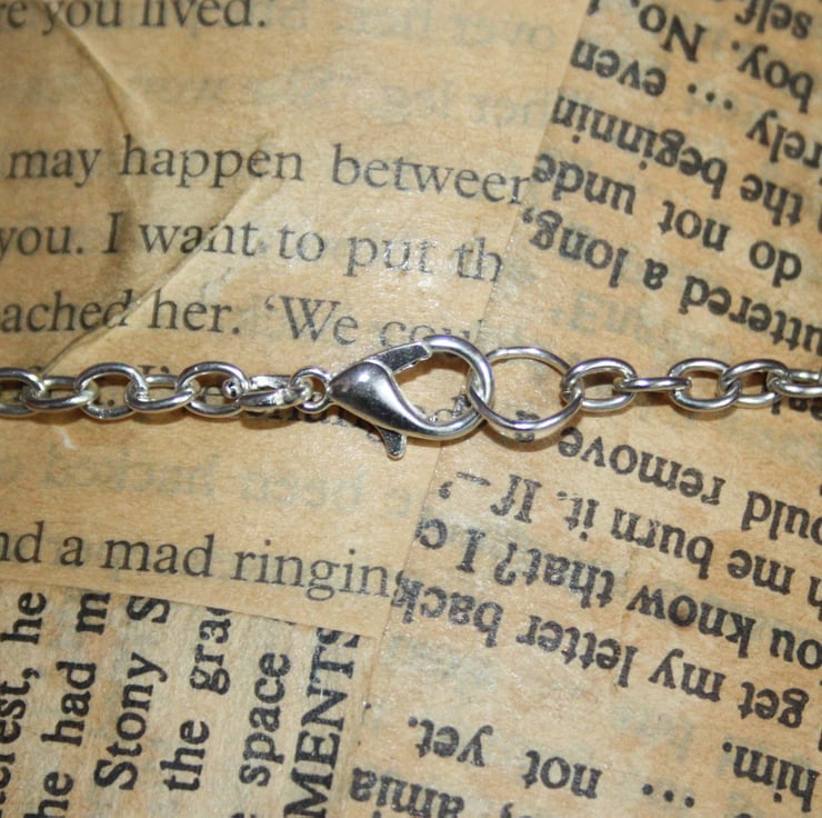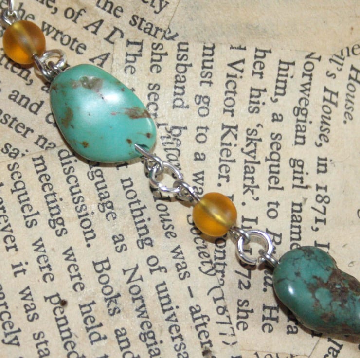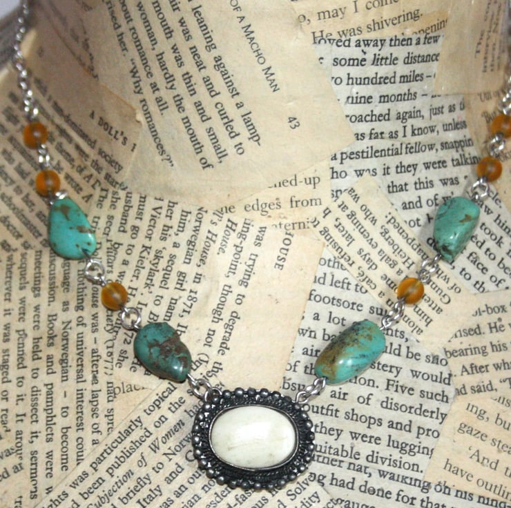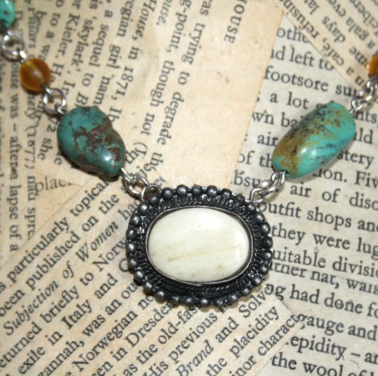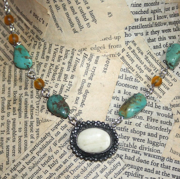 A gunmetal colour cabochon with an intricate design of coils and beads of metal surrounding a creamy stone type centre sits amongst turquoise colour stone type beads interspaced with round amber colour beads. The necklace is completed with a silver tone chain and lobster catch fastening.