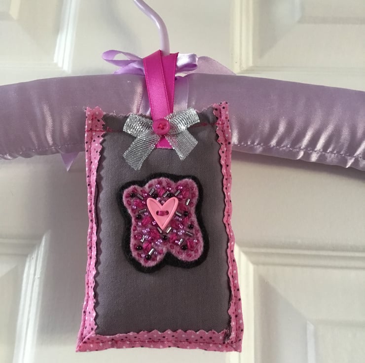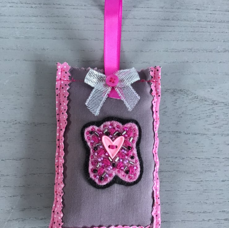 I loved creating the embroidery around this pink heart shaped button, filling the bag with lavender from my garden in Sheffield, Yorkshire.