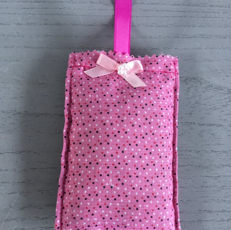This textile bag of lavender is made of two complimentary cotton fabrics, a plain dark pink fabric on one side and a dotted rose pink fabric on the reverse side. This rectangular lavender bag is approximately 11 cms by 8 cms with a long pink hanging loop at the top, attached with a buttoned silver ribbon bow on one side and a pale pink pearled ribbon bow on the reverse side.