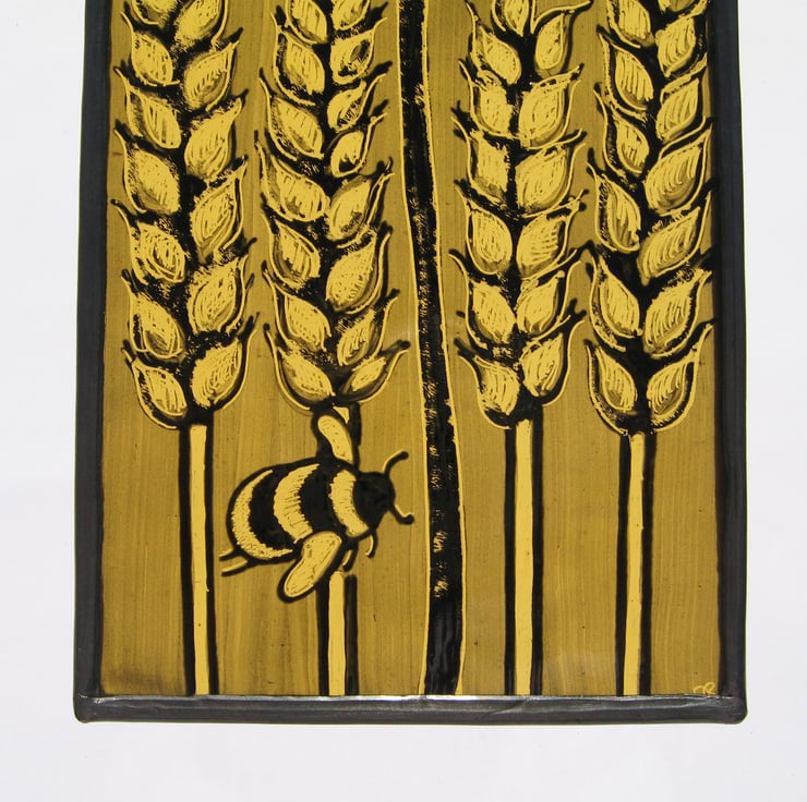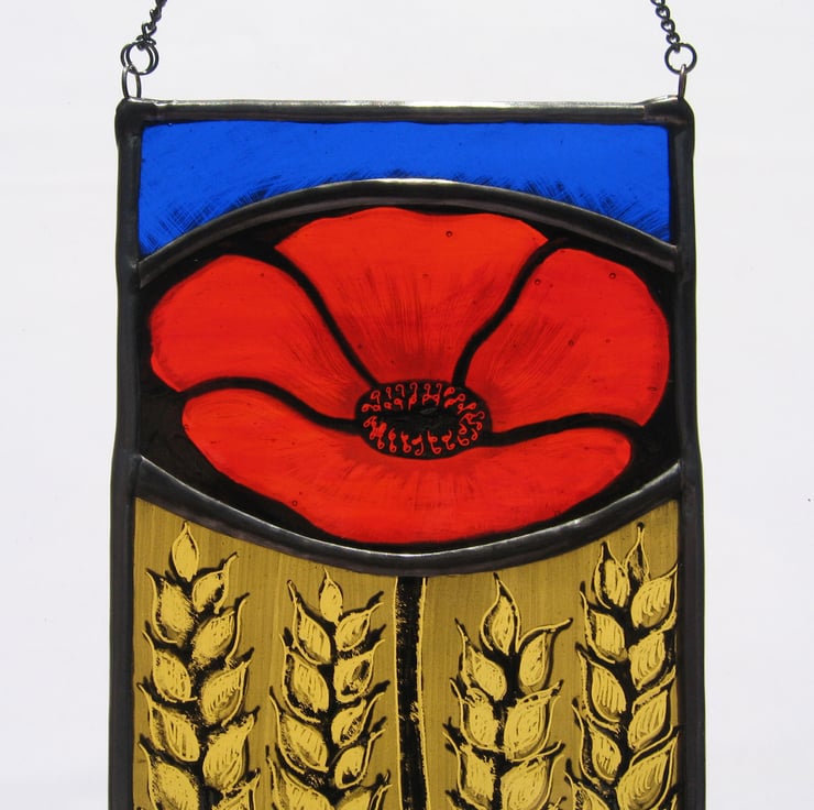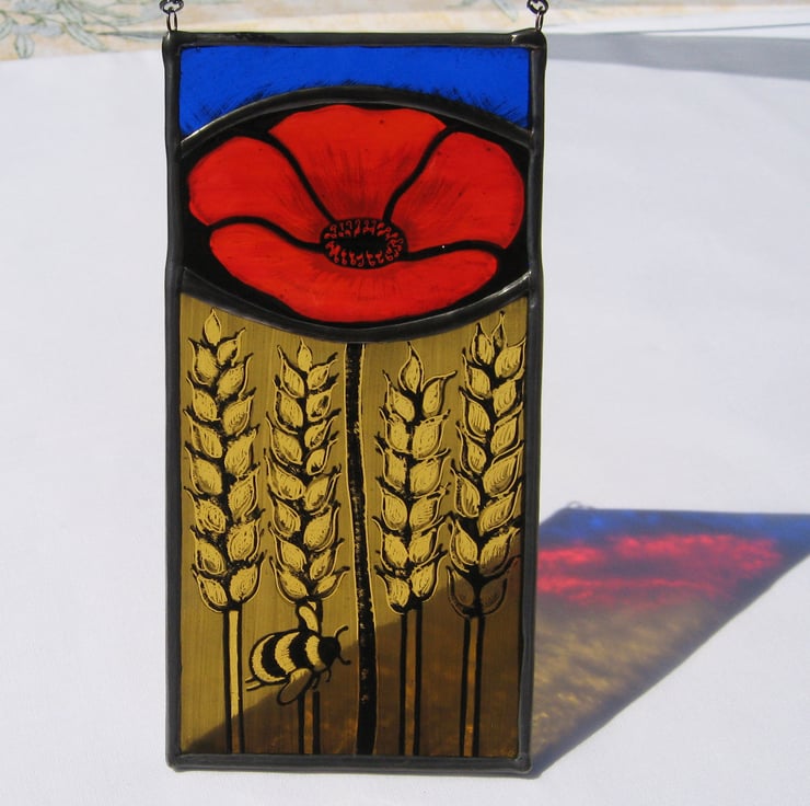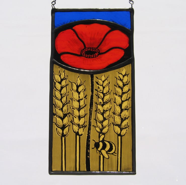 Created using traditional stained glass techniques and materials this panel has been hand painted onto antique style, red and amber glass and fired in a kiln. The tracing paint fuses together with the glass making the image permanent and enduring.