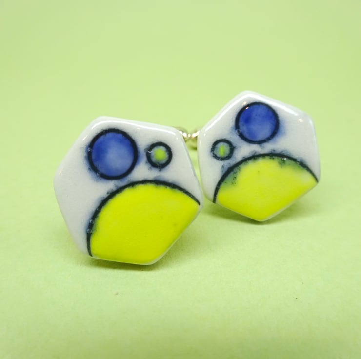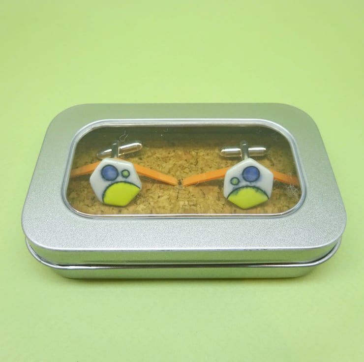 Cufflinks made from semi porcelain with a silver plated backs. They are round with planet/atoms printed into them, these are emphasised in black and then hand painted yellow, blue and green under glazes and finished in a clear glaze. They come displayed in a metal tin.