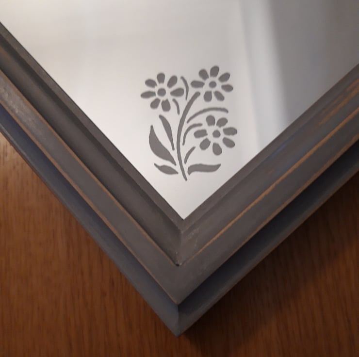 A delicately engraved mirror with flower design, handmade from upcycled palette wood and a large wall mirror. Painted chalky grey with a worn effect to add character, it has been given a wax finish for protection.