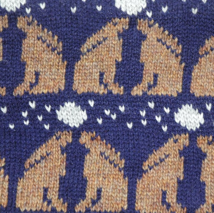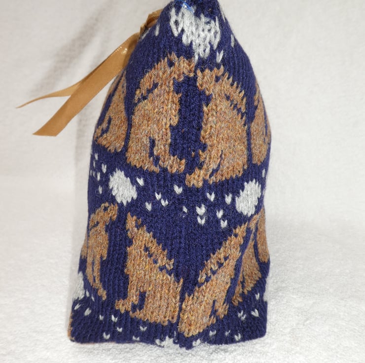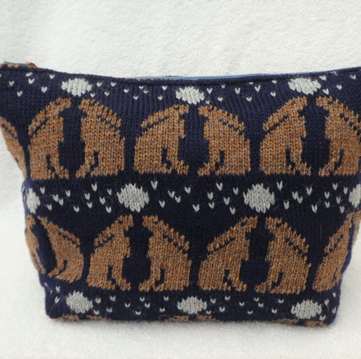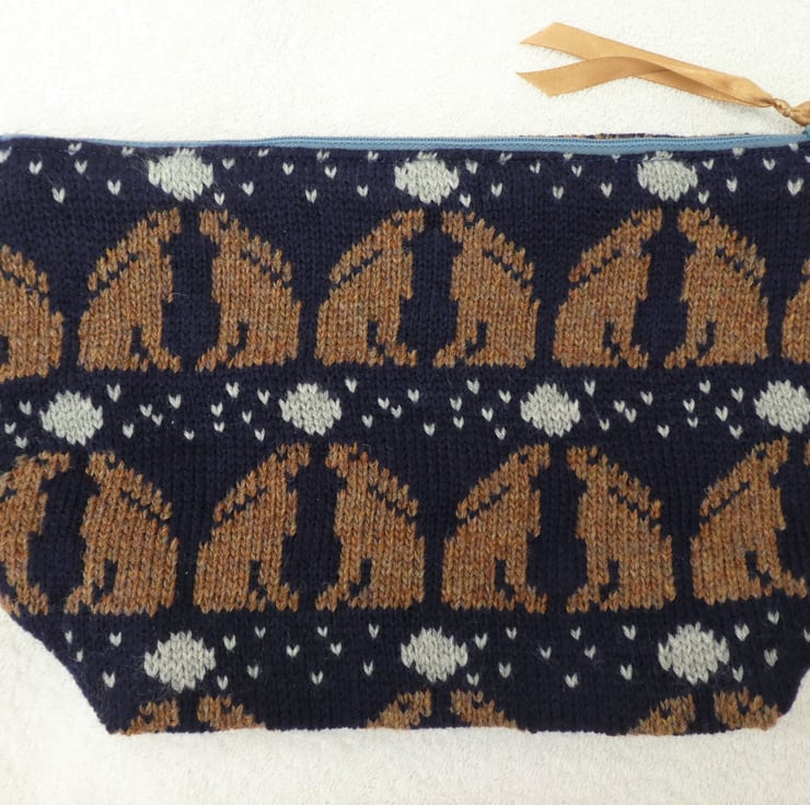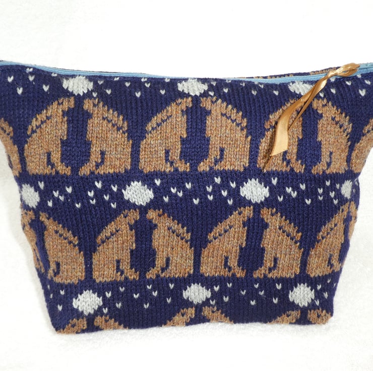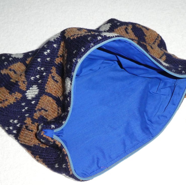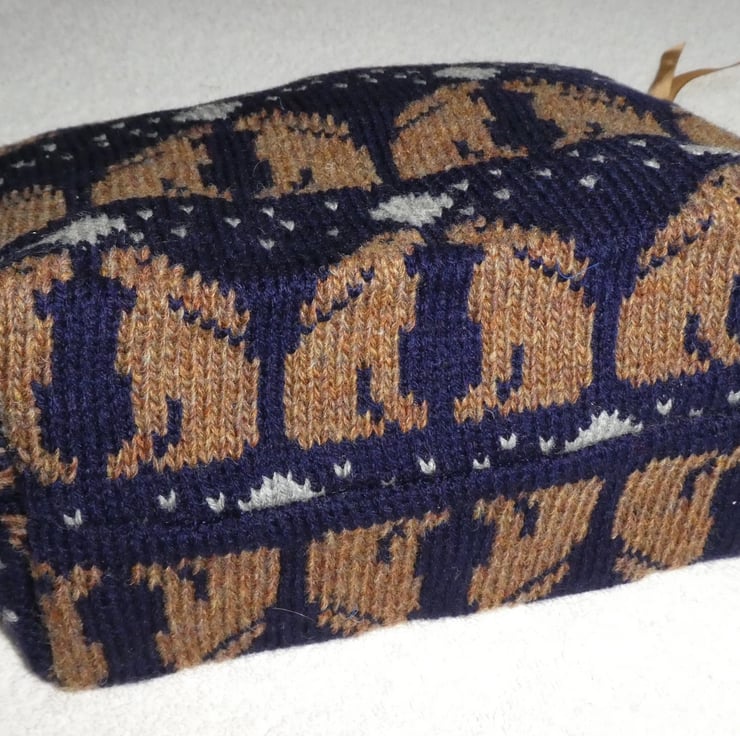 This fabulous holdall has been created from a knitted panel. I created the panel on my 4ply knitting machine, and then cut the panels for the holdall and overlocked the edges to prevent fraying. The pouch is fully lined and has a squared off base to make it really nice and spacious.