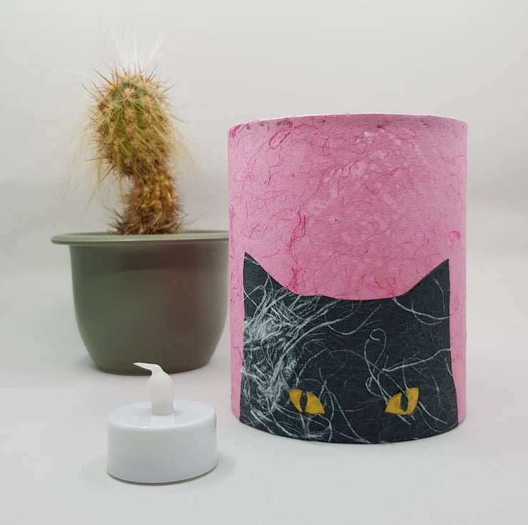 This lantern is a cat lover's dream! The peeking black cat is hand cut from silk paper, and has been given a pair of fabulous yellow-green eyes. The background is a dappled pink colour with pink threads running through, and it's the perfect way to help make a house a home.