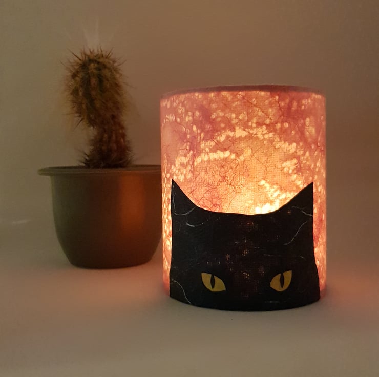 This lantern is a cat lover's dream! The black cat head is hand cut from silk paper, and has been given a pair of fabulous yellow-green eyes. The background is a dappled pink colour with pink threads running through, and it comes complete with an LED candle that flickers gently with a warm cosy glow. It's the perfect way to help make a house a home.